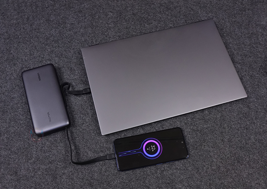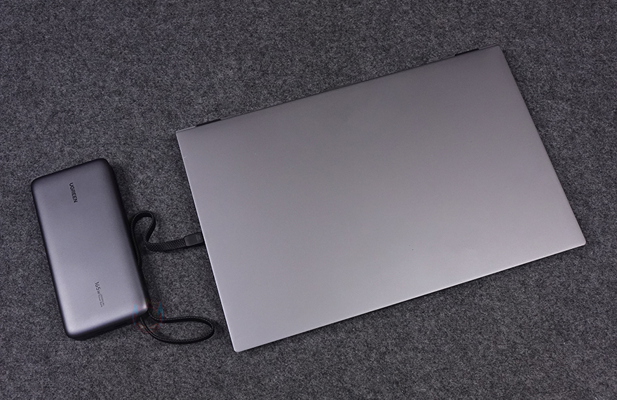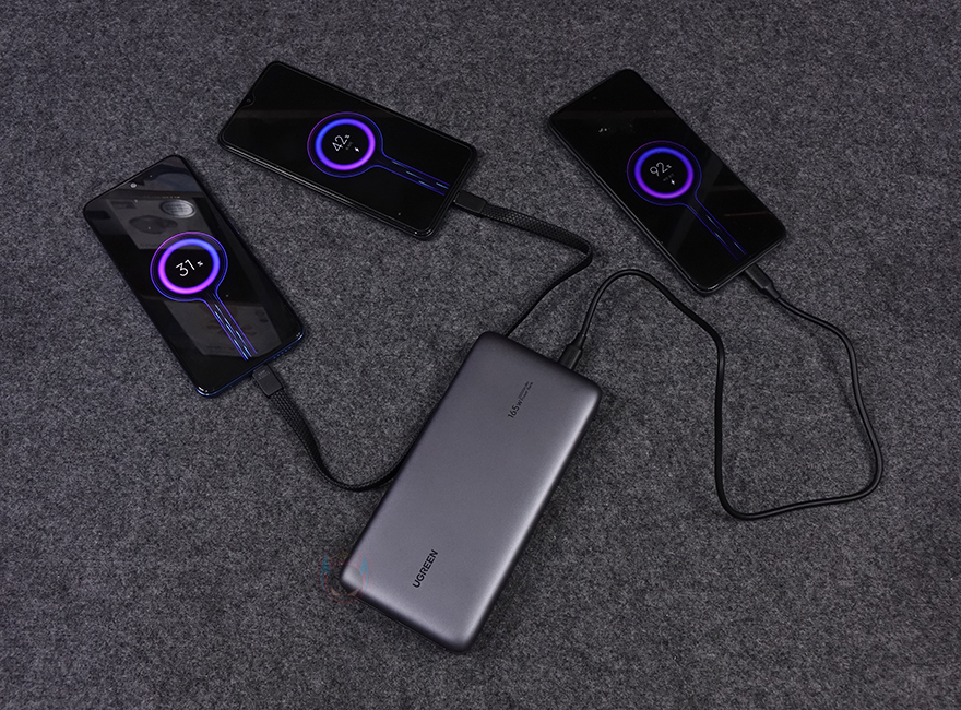 직접, 유그린 케이블 내장 165W 25000mAh 보조배터리를 사용해 보면, 먼저 출시했던 145W 보조배터리처럼 측면 전원 버튼을 누르면 바로 옆에 LED 디스플레이를 통해 배터리 잔량을 확인할 수 있습니다. 물론, 버튼을 연속 2번 누르면 전원을 Off 할 수 있으며, 전원을 켜지 않은 상태에서도 충전할 기기를 연결하면 자동으로 전원이 켜집니다. 그리고, 이 제품의 가장 큰 특징은 역시 2개의 충전 케이블이 내장되어 있어서 별도의 케이블을 챙기지 않아도 바로 사용할 수 있다는 장점이죠. 케이블이 2개 내장이라 기본적으로 충전할 기기를 동시에 2개 할 수 있는데, 실제 스마트폰을 2개 동시에 충전할 수 있어서 편했습니다. 또한, USB 충전케이블도 기본 제공이라 USB-C 포트까지 사용하면 하나의 제품에서 기본 구성으로 최대 3개 기기를 충전할 수 있죠. 뿐만 아니라 개인적으로 마음에 들었던 부분은 PD 3.1 버전에 케이블까지 짧은 편이라 노트북을 충전할 때 매우 유용하다고 느꼈습니다. 물론, 노트북을 충전하면서 사용하는 동안에 스마트폰이나 기타 다른 기기도 동시에 충전할 수 있죠.