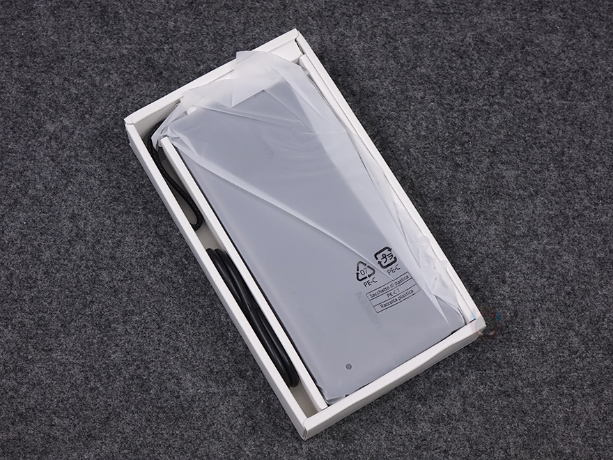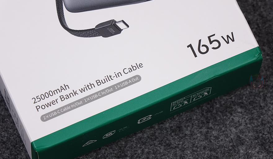박스를 열어보면, 포장 박스를 한 번 더 적용하고 있고, 비닐 포장으로 수납된 케이블 내장 165W 25000mAh 보조배터리를 확인할 수 있습니다. 전체 제품 구성은 케이블 내장 165W 25000mAh 보조배터리, USB 충전케이블, 제품 설명서 및 지침서로 이루어져 있습니다.