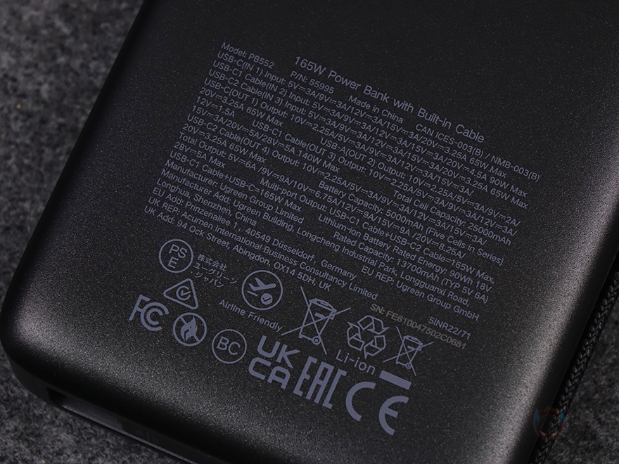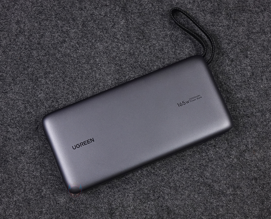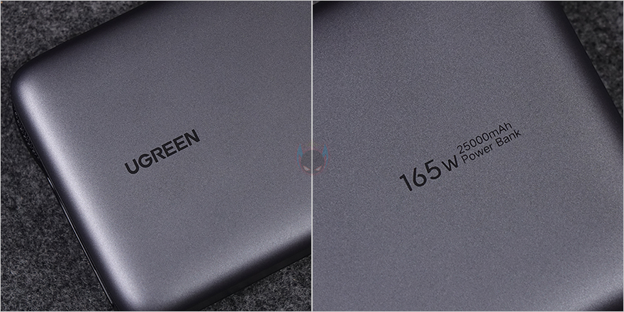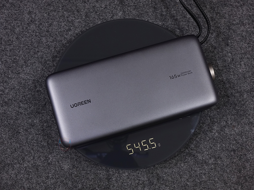 그럼, 유그린의 케이블 내장 165W 25000mAh 보조배터리를 살펴보면, 먼저 외형적인 디자인은 앞서 자사에서 출시한 145W 25000mAh 보조배터리 제품과 유사합니다. 전면 왼쪽에는 UGREEN 로고를 오른쪽에는 165W 25000mAh 표기를 해놨죠. 무게는 약 545g으로 무게감이 있지만, 이전 145W 모델이 노트북 보조배터리로까지 이용되었던 점을 고려하면, 이번 165W 모델로 휴대성에는 큰 무리가 없습니다.