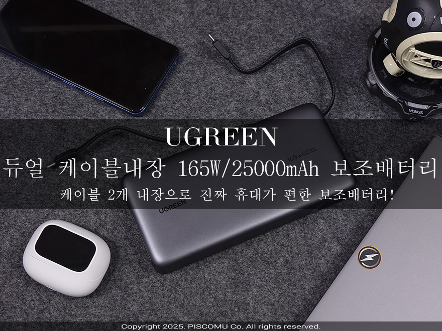 이제 일상생활에서 보조배터리 사용은 필수가 되었죠. 실내뿐만 아니라 야외를 나갈 때도 보조배터리를 챙기는 소비자들이 많습니다. 그만큼 스마트폰뿐만 아니라 다른 휴대할 수 있는 무선 제품들이 많아졌기 때문이라 할 수 있는데, 일반적으로 보조배터리를 챙길 때 케이블도 함께 챙겨야 합니다. 하지만, 은근히 이 케이블까지 함께 챙기는 게 불편하죠. 보조배터리와 케이블을 따로 넣고 휴대하는 경우가 있기 때문이죠. 그래서, 최근 출시되는 보조배터리 제품들은 케이블을 내장하고 나오는데, 이게 점점 출시의 트렌드가 되고 있습니다. 국내 소비자들에게도 보조배터리와 충전기로 인지도가 높은 유그린(UGREEN)에서도 최근 출시한 보조배터리에 케이블 내장을 적용했는데, 그것도 1개 아닌 2개를 내장했죠. 또한, 총 165W 충전지원에 배터리용량도 25,000mAh를 가졌습니다. 그래서, 이번 시간에는 유그린의 최신 보조배터리로 출시한 케이블 내장의 165W 25000mAh 보조배터리를 한 번 살펴볼까 합니다. 그럼,