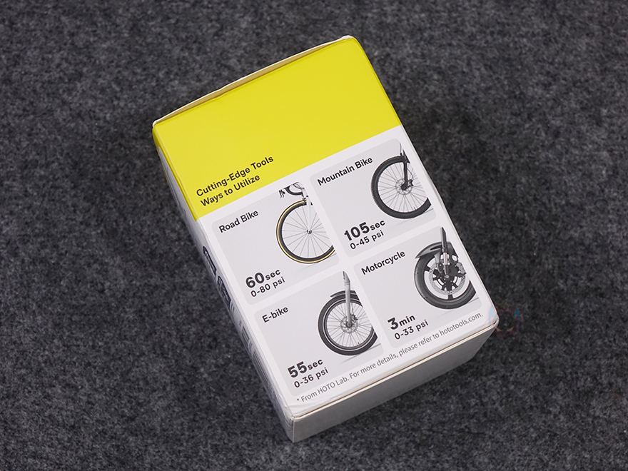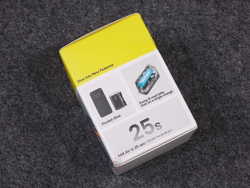 제품 패키지부터 살펴보면, 제품 이름에 포켓이라는 단어답게 제품 박스도 일반적인 휴대용 에어펌프보다 작습니다. 박스 크기만 스마트폰과 비교해도 작죠. 전면에는 제품 이미지와 함께 모델명 그리고 콘셉트 문구에 주머니에 들어간 포켓 사이즈(Pocket size)라는 문구를 확인할 수 있고, 한쪽 측면에는 이 부분을 주요 특징으로 스마트폰과 비교한 이미지를 담고 있습니다. 또한, 2000mAh 배터리 탑재와 25초 만에 60~80 psi 공기압을 강조하고 있죠. 반대쪽 측면에는 제품을 사용할 수 있는 주요 타깃으로 각 종 바이크를 언급하고 있으며, 각 바이크의 적정 psi 값도 표기해 놨습니다. 그리고, 후면에는 제품의 기본 사양을 표기해 놨습니다.