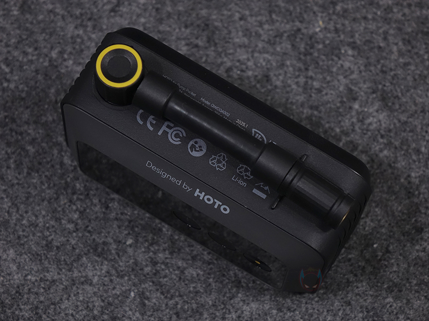 본격적으로 HOTO의 Air Pump Pocket를 살펴보면, 일단 한눈에 봐도 사이즈가 작다란 걸 쉽게 체감할 정도로 작은 사이즈를 자랑합니다. 정확히는 93×58×38mm 크기를 가졌는데, 두께를 제외하고 면적만 놓고 요즘 스마트폰과 비교해 봐도 작은 사이즈임을 알 수 있고, 성인 손바닥보다 작은 편이라 주머니에 넣고 다닐 수 있는 정도죠. 무게도 약 260g으로 스마트폰보다 약간 무거운 편이라 휴대에 무게 부담감이 전혀 없습니다.
