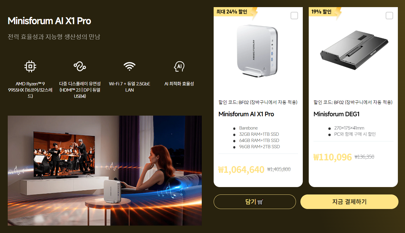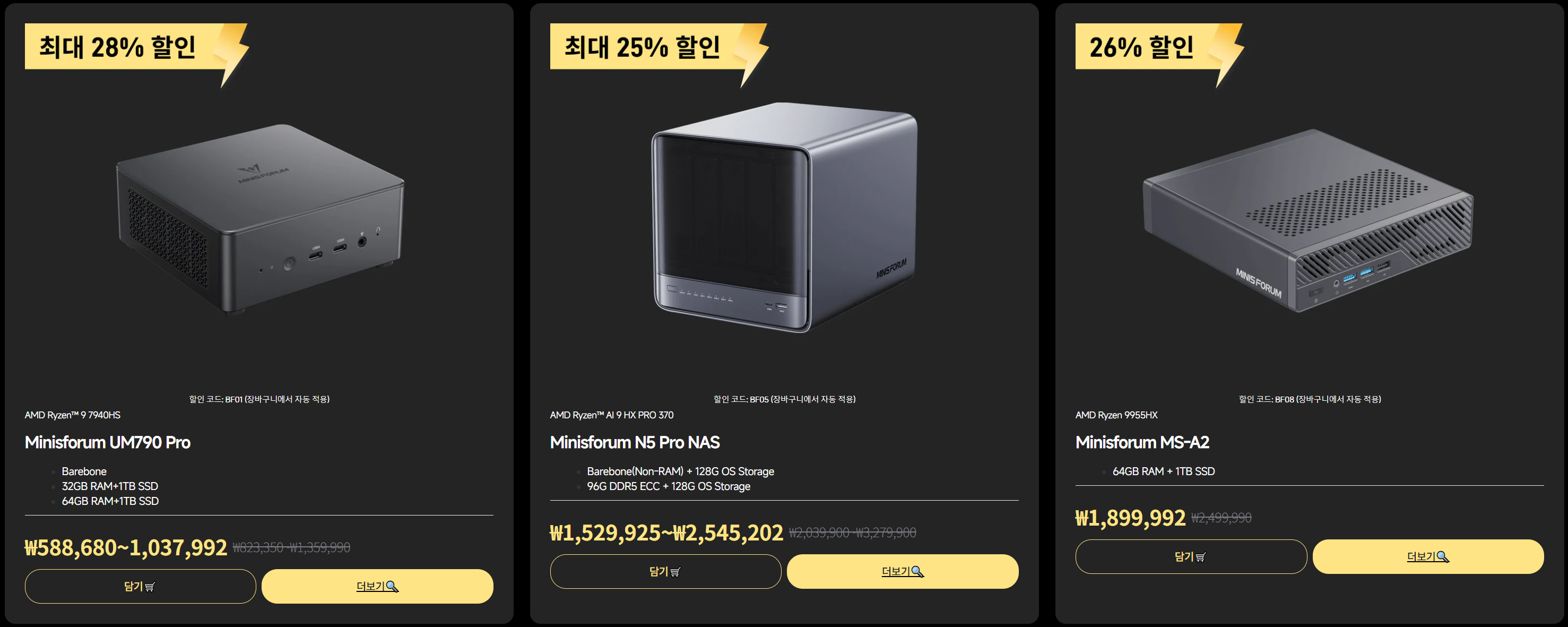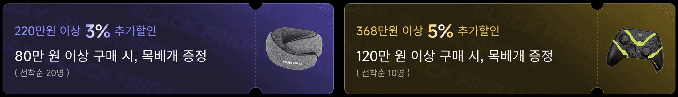차별화된 미니PC로 글로벌 시장에서 인정받고 있는 미니스포럼(Minisforum)이 한국 시간으로 11월 14일부터 28일까지 최대 30% 할인의 블랙프라이데이 특가 행사를 시작한다. 이번 행사는 각 나라별 미니스포럼 공식 사이트에서 진행되며, 한국 역시 미니스포럼 코리아 공식 사이트에서 진행된다. 특히, 이번 행사에는 가격대별로 3%, 5% 추가 할인을 해주는 동시에 선착순으로 목베개와 게임패드를 사은품으로 증정해주고 있다.