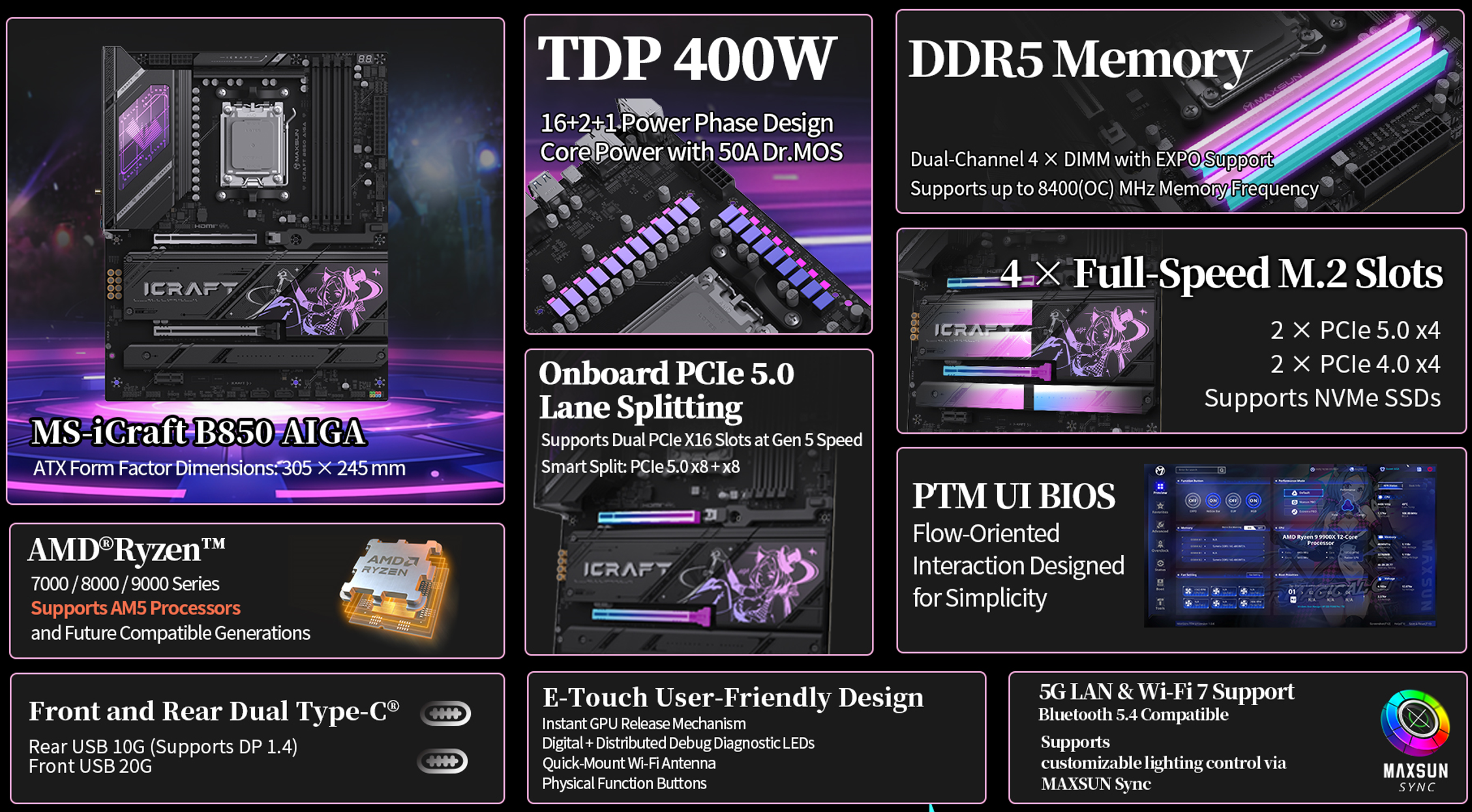 다음 달에 출시하는 iCraft B850 AIGA 메인보드는 ATX 폼규격에 전체적으로 블랙 색상 디자인을 배경으로 하고 있으며, 전원 히트싱크부분에 자사의 RGB 라이트닝효과 디자인 중 하나인 Skylight RGB를 적용하고 있고, 메인 칩셋과 M.2 SSD 슬롯에 장착된 히트싱크에는 AIGA 캐릭터 디자인을 홀로그램 디자인으로 적용하고 있다. 또한, AMD B850칩셋 기반으로 AMD 라이젠 AM5 CPU 최신 모델 지원과 다음 세대 CPU 지원까지 갖추고 있으며, 전원부는 16+2+1 페이즈 구성, 8400MHz 클럭의 DDR5 메모리 지원, PCIe 5.0x4와 PCIe 4.0x4 M.2 SSD 슬롯을 각각 2개씩 총 4개의 슬롯을 갖추고 있다. 이밖에도 최근 자사에서 발표한 인텔 800 시리즈 메인보드에만 적용되던 PMT BIOS도 AMD 800 시리즈 메인보드에 적용되기 시작했는데, iCraft B850 AIGA 역시 PMT BIOS를 적용해서 나올 예정이다.