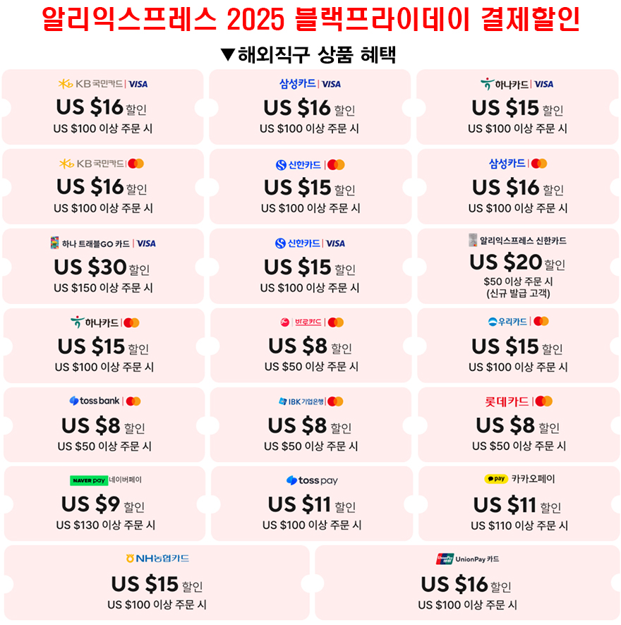 알리익스프레스 2025 블랙프라이데이는 19일까지 진행되었던 11.11 광군제와 맞먹는 수준으로 진행된다. 즉, 결제할인과 할인코드 할인율이 거의 비슷하다. 먼저, 결제할인은 광군제에서 크게 할인해주었던 신생카드 할인이 블랙프라이데이에서는 빠졌고, 나머지는 그대로 동일하게 적용된다. 신생카드는 말그대로 최근에 출시된 카드이기때문에 사실상 대중적으로 소비자들에겐 큰 효과가 없다. 그래서, 사실상 나머지 결제할인들은 광군제와 동급이다. 그리고, 할인코드 역시 거의 광군제때와 비슷하다. 정확히는 100달러미만 할인코드는 동일하고, 100달러이상 할인코드는 광군제때보다 1~5달러정도 높아졌다. 큰 차이는 아니기때문에 광군제때 놓쳤던 상품이 있었다면, 이번 2025 블랙프라이데이에서 다시 구매하면 된다.