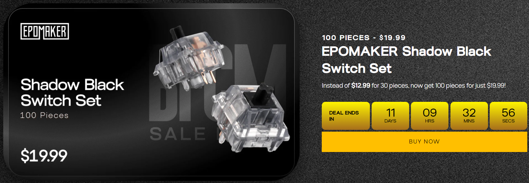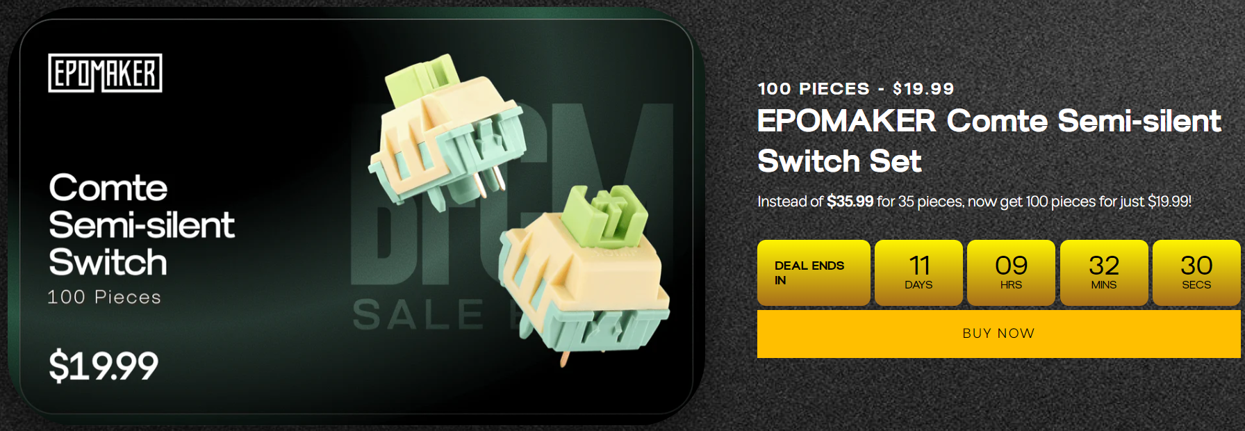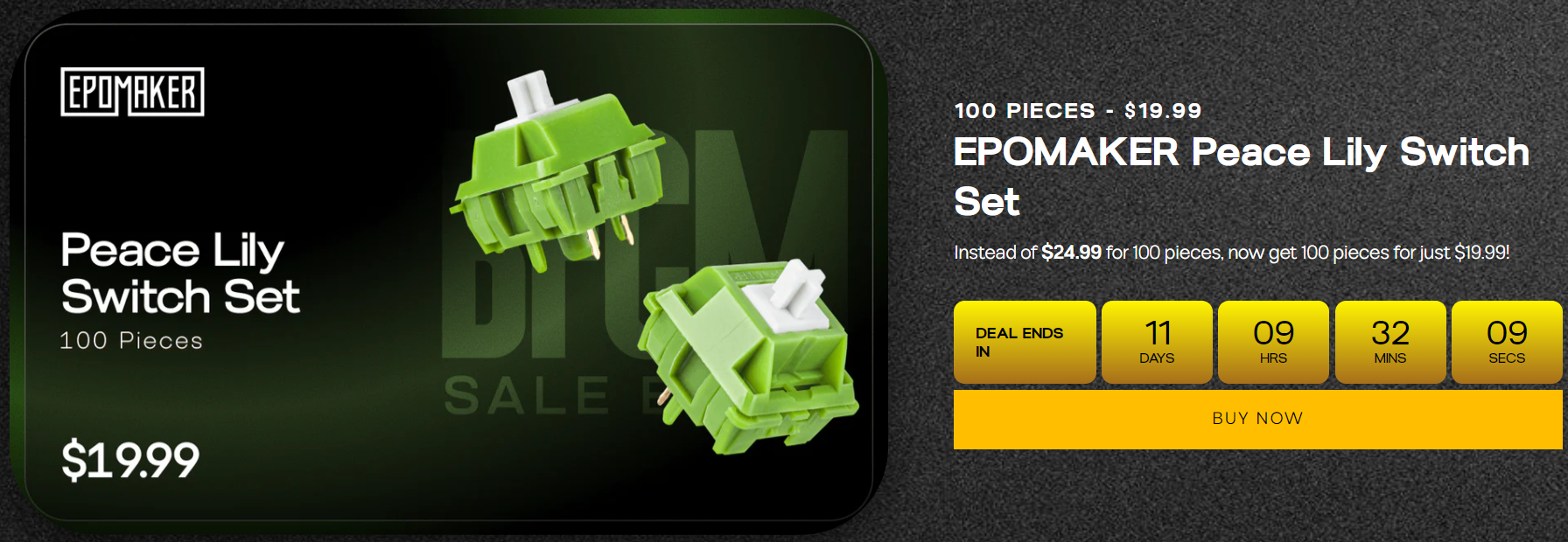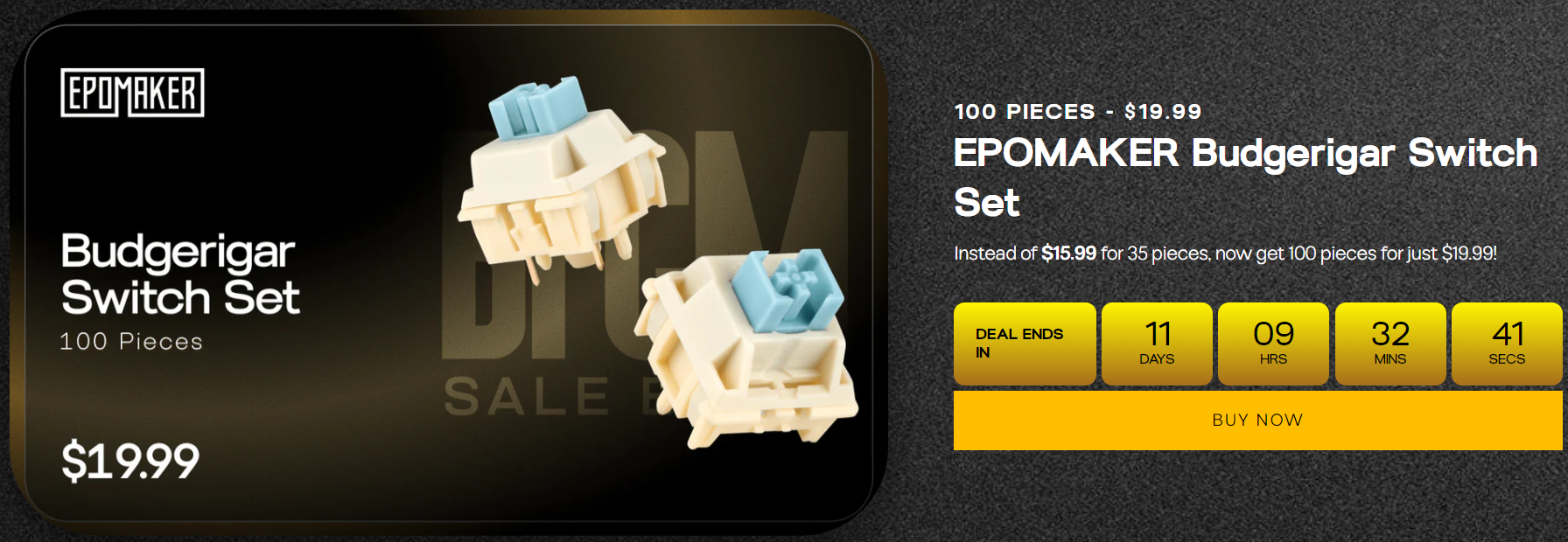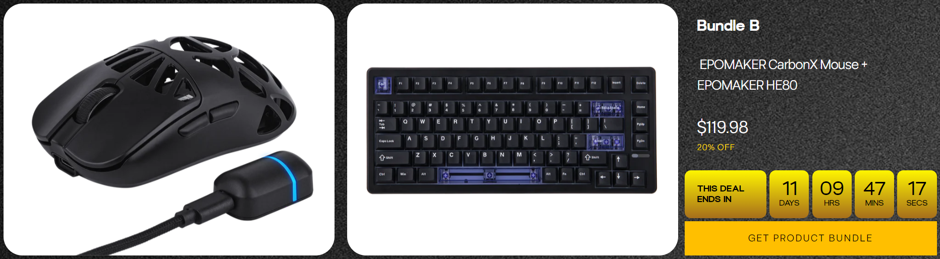 먼저, 행사시간 중에는 키보드와 마우스 세트를 20% 할인된 가격에 구입할 수 있는데, 총 4가지 번들 중에 선택할 수 있다. 번들 A는 Click Lite Mouse + Galaxy100 Lite, 번들 B는 CarbonX Mouse + HE80, 번들 C는 AULA SC800 Mouse + EPOMAKER X AULA F108 PRO (LEOBOG Reaper Switch), 번들 D는 EPOMAKER Click Mouse + EPOMAKER TH99 (ANSI)다. 이밖에도 스위치 100개 세트를 평소보다 저렴한 가격에 구입할 수 있는데, Wisteria Tactile, Shadow Black, Budgerigar, Comte Semi-silent, Peace Lily 스위치 총 5가지 종류 중 선택할 수 있다.