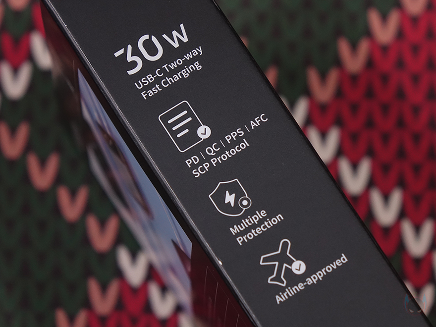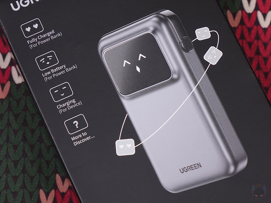 제품박스부터 살펴보면, 전면에 제품 이미지를 담고 있어서 박스를 개봉하기 전에 제품 디자인을 미리 확인할 수 있습니다. Uno 시리즈 특유의 이모티콘 스크린이 적용된걸 미리 알 수 있죠. 제품 이미지 옆에 배터리 상태에 따른 이모티콘 표기도 함께 담고 있으며, 아래에 모델명과 함께 배터리 용량과 케이블 내장 이미지도 확인할 수 있죠. 박스 한쪽 측면에는 30W 충전 지원과 함께 충전 규격과 보호회로, 기내 탑승 시 반입이 가능한 항공 승인을 표기해 놨으며, 반대쪽 측면에는 충전 지원에 대해서 이미지와 함께 좀 더 쉽게 이해되도록 담고 있습니다. 또한, 박스 후면에는 제품 사용의 연출 이미지와 함께 아래에는 제품 기본 사양을 표기해 놨죠.