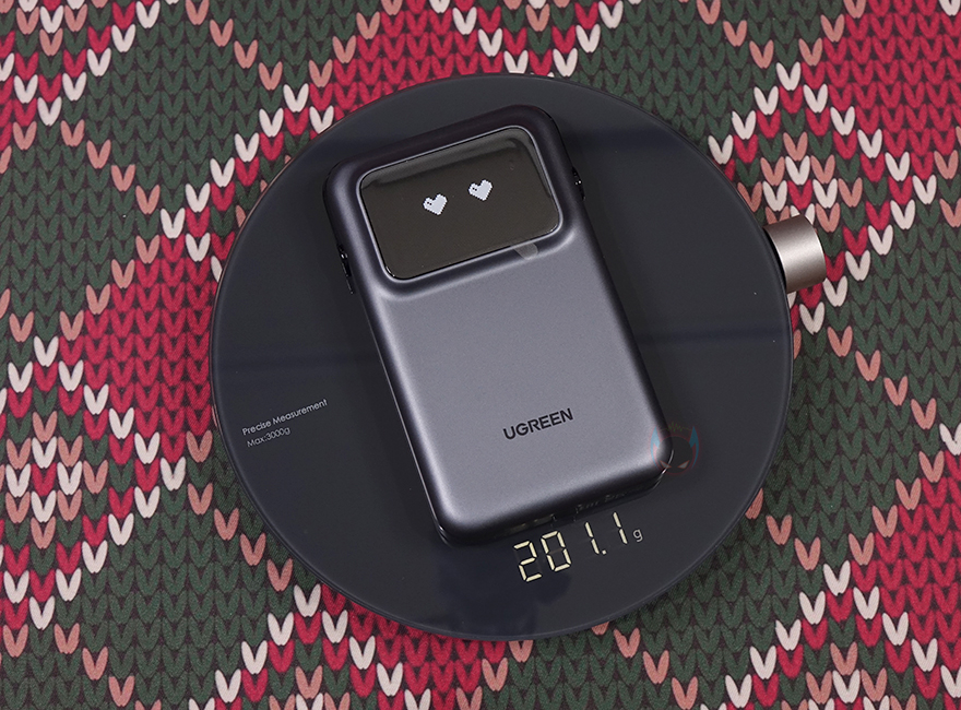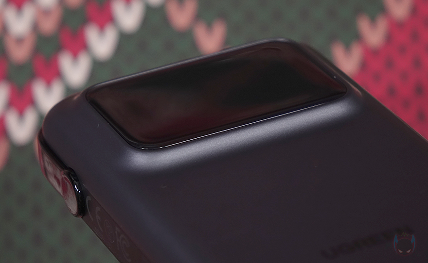 그럼, 유그린의 Uno 30W 보조배터리를 살펴보면, 슬림한 바(Bar) 형태로 스마트폰과 면적 크기를 비교해 보면, 좀 더 작습니다. 무게는 약 200g으로 스마트폰 무게와 비슷해 휴대에도 최적이죠. 그리고, 디자인에서 가장 먼저 눈에 들어오는 부분은 역시 스크린 화면 부분으로 개봉 시에는 보호비닐이 부착되어 있는데, 보호비닐에 이모티콘을 새겨놨습니다. 그리고, 화면 부분은 배터리보다 좀 더 앞으로 볼록하게 나온 형태로 제품을 세워서 보면 Uno 시리즈답게 로봇 캐릭터 감성을 줍니다.