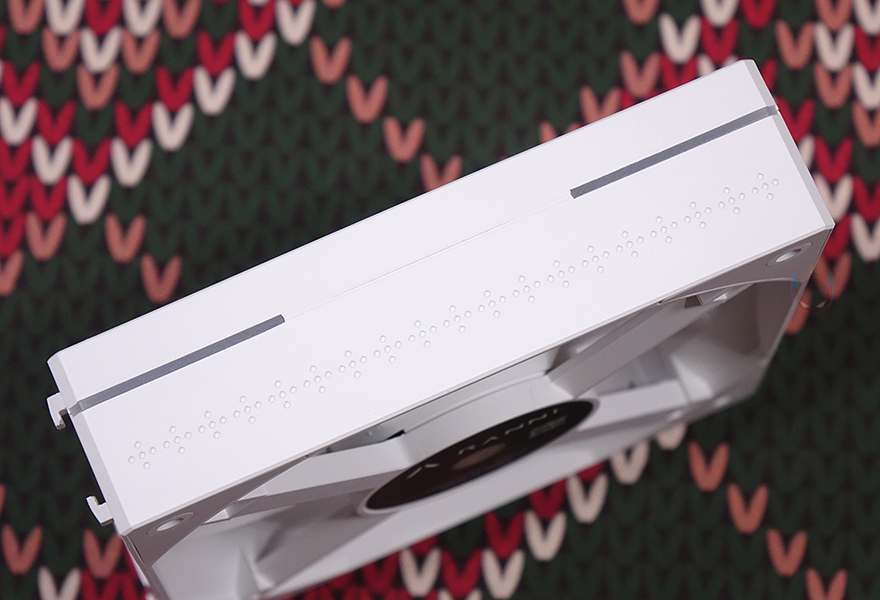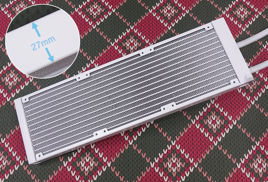 연결된 각 팬은 아래로 밀면 분리가 되고, 반대로 위로 밀면 체결이 되는 구조로 120mm 크기에 7개의 날개를 가졌고, 최대 2700(±10%)RPM까지 작동합니다. 그리고, 날개 주변의 프레임 부분에 RGB 효과를 볼 수 있게 디자인이 처리되었으며, 프레임 측면에도 RGB 효과 디자인을 적용해 놨는데, 이 역시 디스플레이가 적용된 수냉쿨러 제품들의 특징 중 하나입니다. 그리고, 팬 두께는 일반 120mm 팬의 25mm보다 좀 더 두꺼운 30mm로 보통 이렇게 팬이 두껍다란 것은 팬의 쿨링 효과를 높일 경우에 적용되죠. 라디에이터는 일정간격으로 핀이 나란히 배열되어 있으며, 바깥쪽에도 팬을 장착할 수 있게 나사홀이 처리되어 있어 듀얼 팬 구성이 가능합니다. 참고로, 라디에이터 두께는 27mm로 표준 두께입니다.
