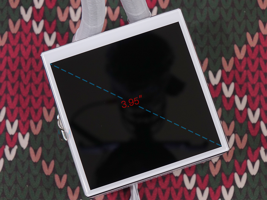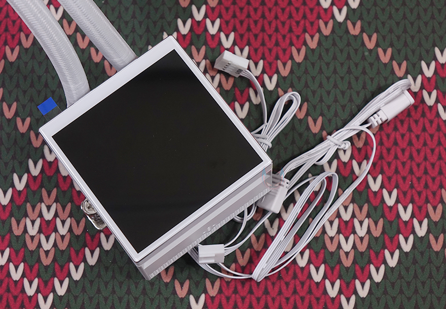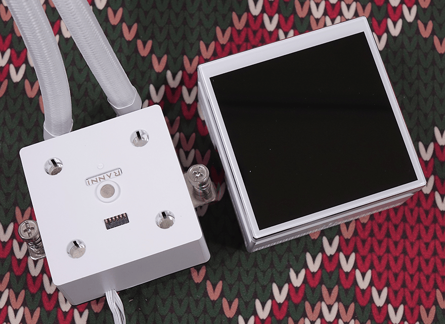 워터블록은 앞서 제품 박스에서 잠깐 언급했듯이 디스플레이가 적용되었습니다. 물론, 이전 라니 시리즈 제품에서도 디스플레이는 적용되었지만, 이번에 처음으로 사각 디자인의 디스플레이로 적용되었고, 단순 고정화면의 모니터링 디스플레이라 아니라 소프트웨어를 통해 사용자가 커스텀할 수 있는 디스플레이로 적용되었죠. 개봉시 디스플레이에는 보호비닐이 부착되어 있어서 사용 전 제거를 해야 하며, 화면 크기는 3.95인치 대화면에 IPS 패널이 적용되었고, 워터블록에서 디스플레이만 손쉽게 분리할 수 있게 마그네틱 방식을 적용했습니다. 조금 아쉬운 부분이라면, 화면 연결의 포고핀이 고정위치라 디스플레이 회전은 지원하지 않습니다. 그리고, 디스플레이 측면에도 팬과 마찬가지로 RGB 효과를 볼 수 있게 디자인 처리되어 있으며, 워터블록에는 펌프 작동의 4핀 PWM 커넥터와 디스플레이 작동 연결에 USB 내부헤더 케이블, 5V ARGB 케이블이 적용되어 있습니다. 그리고, 워터블록에는 고정 마운트가 기본 적용되어 있으며, CPU와 맞닿는 베이스 부분에는 개봉 시 보호스티커가 부착되어 있기 때문에 제거를 해야 하고, 스티커를 제거하며 구리재질에 깔끔하게 래핑 처리된 표면을 확실할 수 있죠.