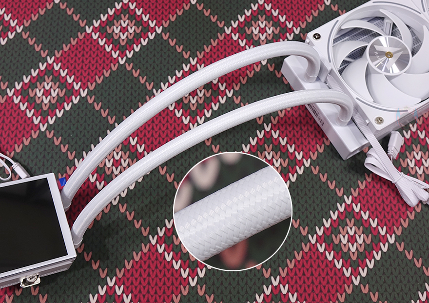 라디에이터와 워터블록을 연결하는 튜브의 길이는 40cm이며, 소재는 유연하면서 강한 내구성을 가진 최근 수냉쿨러에서 많이 적용되는 IIR(부틸고무)+EPDM(합성고무) 소재를 적용했고, 외부 마감을 깔끔하게 슬리빙처리해놨습니다. 물론, 튜브의 양쪽 연결부도 누수가 발생하지 않도록 깔끔하게 마무리되어 있고, 워터블록 쪽은 좌우 각도조절이 됩니다.