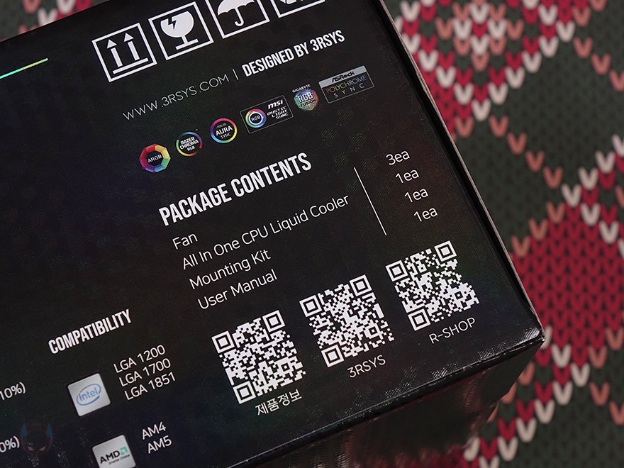 제품 패키지는 박스형태로 구매시, 박스 전체까지 밀봉처리된 걸 확인할 수 있습니다. 소비자입장에선 아무래도 이런 포장방식이 좀 더 판매제품에는 신뢰가 가죠. 박스 디자인은 전체적으로 블랙 색상을 배경으로 전면에는 제품 이미지를 담고 있는데, 뒤에서 다시 언급하겠지만, 라니 WV 360 ARGB 수냉쿨러는 블랙과 화이트 2가지 색상으로 출시되었습니다. 박스에는 블랙 색상의 이미지로 통일시켰으며, 오른쪽에 스티커로 색상 구분 표시를 하고 있죠. 그리고, 색상 구분 표시 스티커 옆에 담긴 제품 이미지를 보면 수냉쿨러의 워터블록 부분으로 디스플레이가 적용된 걸 미리 알 수 있고, 분리형이라 것도 알 수 있습니다. 모델명은 홀로그램식으로 표기를 해놨으며, 제품 이름에 ARGB가 붙어서 5V ARGB 지원의 제품임을 알 수 있고, 박스 한쪽에도 각 메인보드 제조사 및 게이밍 브랜드에서 지원하는 ARGB 지원 표기를 추가로 확인할 수 있습니다.