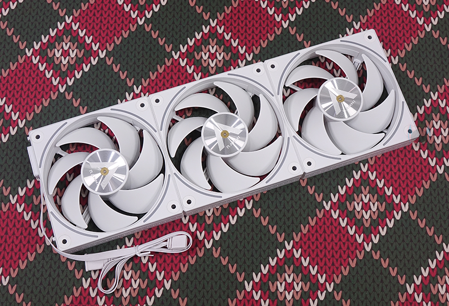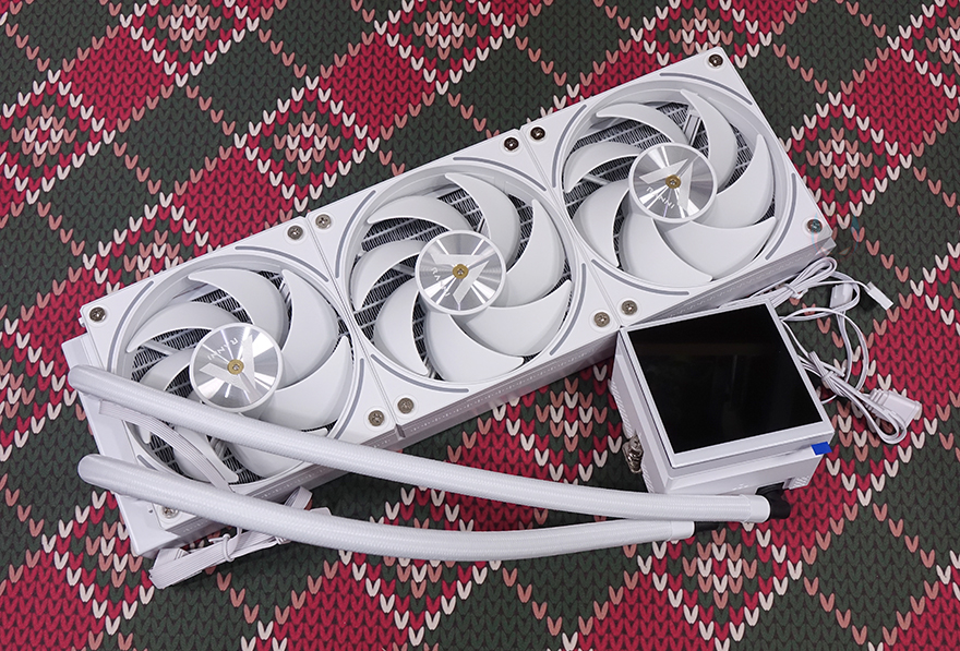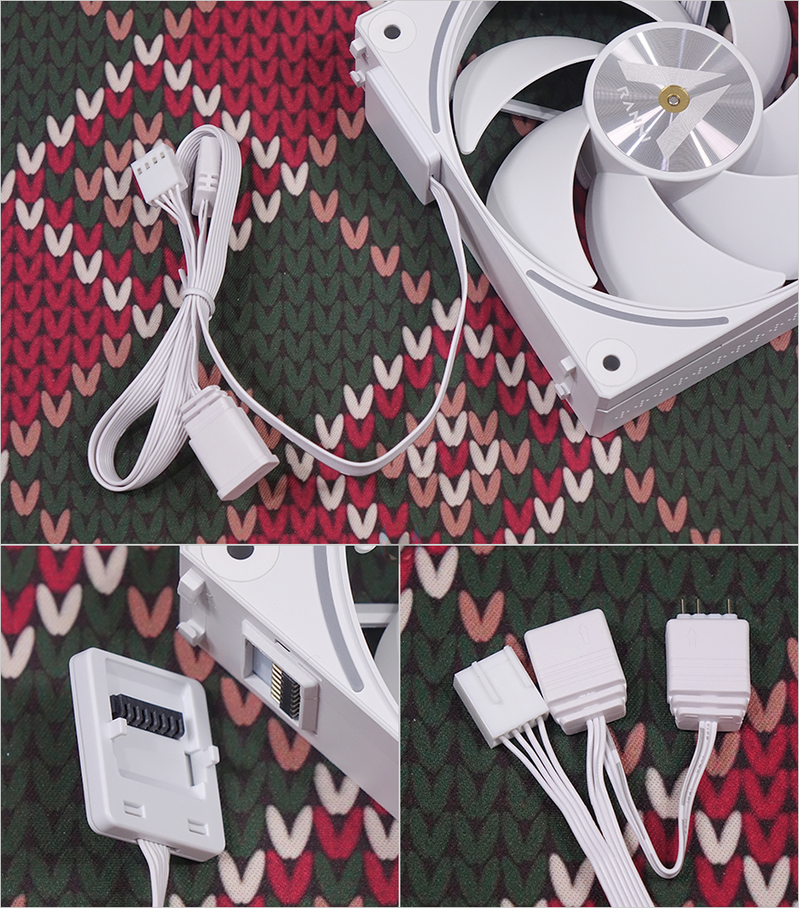 본격적으로 3RSYS의 라니 WV 360 ARGB 수냉쿨러를 살펴보면, 색상은 지금까지 라니 시리즈 제품들이 블랙과 화이트 2가지 색상으로 출시했던 것처럼 이번 제품도 블랙과 화이트 2가지 색상으로 출시했습니다. 부위별로 좀 더 자세히 살펴보면, 라디에이터는 360mm로 크기에 맞춰 3개의 팬이 기본 장착되어 있습니다. 물론, 나사를 풀면 팬을 분리할 수 있고, 각 팬은 케이블 없이 서로 연결된 데이지 체인 방식을 적용했습니다. 최근 수냉쿨러에 장착되는 팬의 특징이기도 한데, 케이블은 팬 한쪽에만 연결해서 케이블 정리가 수월합니다. 물론, 케이블 분리도 가능하며, 케이블은 팬 작동의 PWM 케이블과 5V ARGB 헤더와 연결할 수 있는 커넥터 및 연장선까지 적용되어 있죠.
