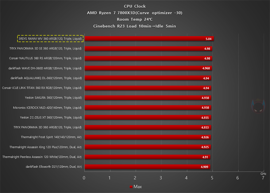 끝으로, 라니 WV 360 ARGB 수냉쿨러의 성능을 확인해보는데, 시스템 기반은 AMD 라이젠 7 7800X3D CPU이며, 최근 CPU들은 높은 부스트 클럭을 갖추고 있기 때문에, 예전처럼 수동 오버클럭의 매력이 사라졌습니다. 테스트에 사용된 AMD 라이젠 7 7800X3D CPU는 인가 많은 CPU 중 하나이며, 수동 오버클럭보다는 AMD 자체에서 성능향상으로 다룰 수 있는 PBO나 커브옵티마이저(-30) 설정으로 더 많이 사용하죠. 그래서, 테스트 역시 커브옵티마이저(-30) 설정으로 적용해, 렌더링 벤치마크 프로그램의 씨네벤치 R23으로 10분간 과부하 Load로 진행하고, 과부하 후 5분간 Idle로 돌아가는 상황에서 CPU의 온도와 팬 속도, 쿨러 소음, 냉각성능에 따른 부스트 작동 최대 클럭을 확인해 봤습니다.