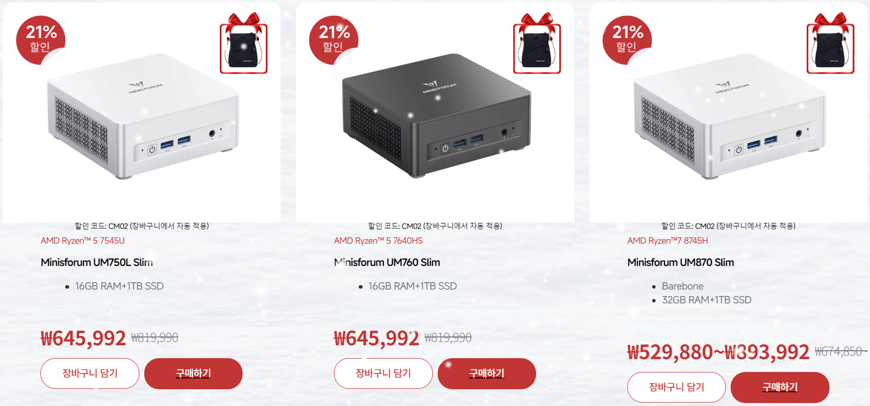 이번 크리스마스 세일에서는 연말 할인행사답게 인기제품부터 최근 출시한 제품까지 사실상 한국시장에 판매되는 모든 제품이 할인되고 있는데, 제품마다 최소 21%~ 최대 29% 할인이 적용되고 있으며, 각 제품별로 사은품 증정이 진행된다. 또한, 최근에 출시한 워크스테이션급 미니PC MS-S1 MAX와 막강한 게이밍 미니PC로 주목받는 G1 Pro는 장바구니에 담으로 자동으로 할인코드가 적용되어 할인받을 수 있다. 한편 미니스포럼 코리아는 글로벌시장에 적용되는 보증 혜택을 한국시장에도 그대로 적용하고 있는데, 무료배송부터 1년 무상보증기간, 30일 반품/교환, 포인트 혜택 등을 지원해주고 있다.