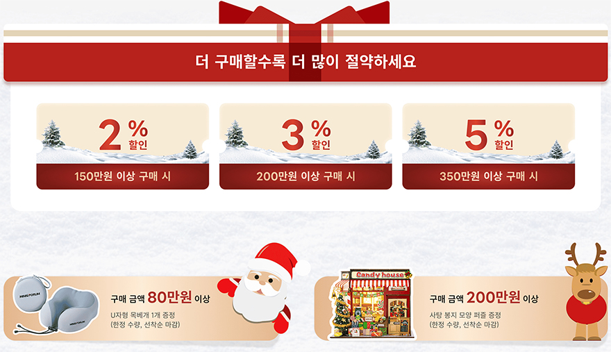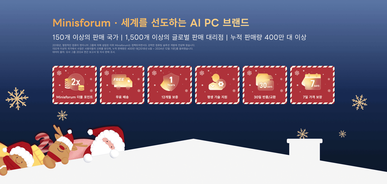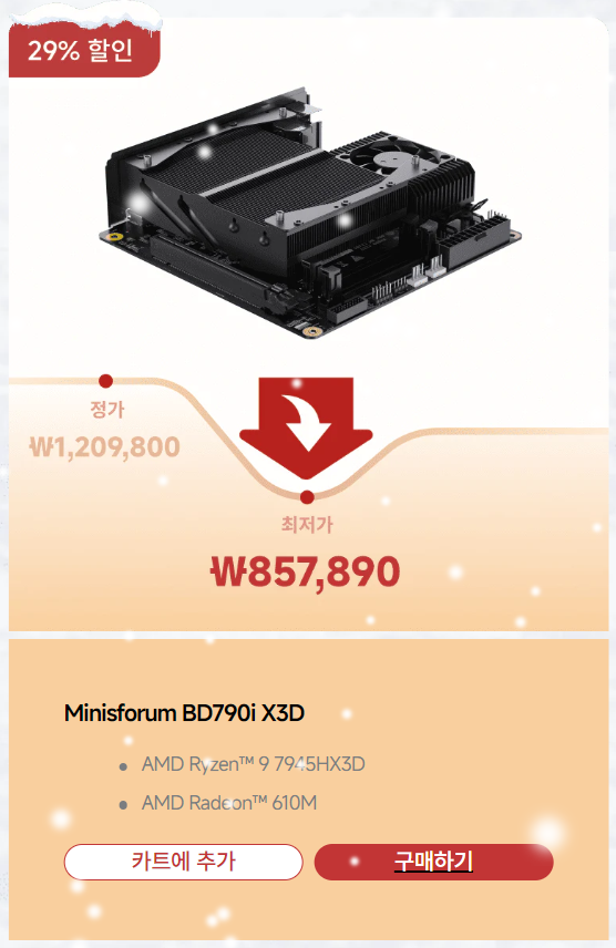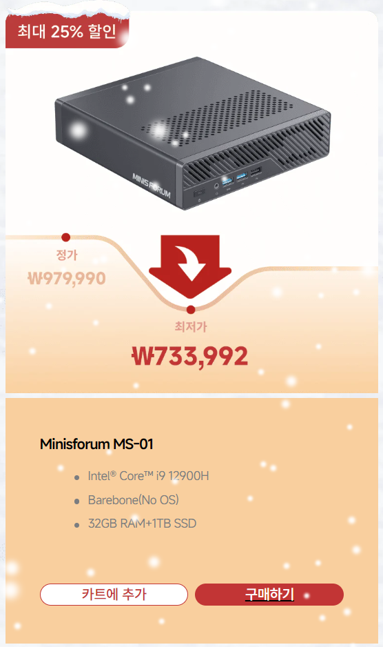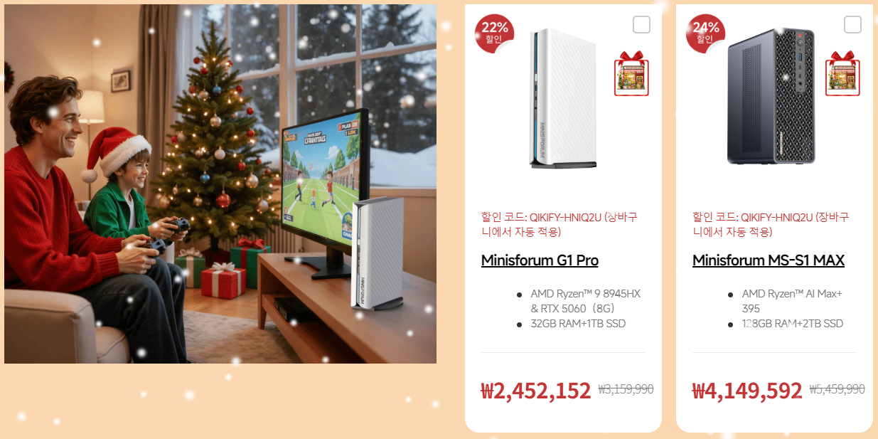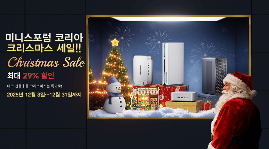 글로벌 미니PC 시장을 선두하는 미니스포럼(Minisforum)이 12월 3일부터 한국 공식 스토어이자 자사 홈페이지 미니스포럼 코리아(https://www.minisforum.kr/pages/2025-christmas-sales)에서 최대 29% 할인의 2025년 크리스마스 세일을 시작했다. 이번 크리스마스 세일은 연말 마지막 할인행사로 다양한 할인 혜택이 주어지는데, 구입 가격대별로 최소 2%~최대 5% 할인을 받을 수 있고, 80만원이상 구매시에는 U자형 목베개, 200만원이상 구매시에는 3D퍼즐을 사은품으로 증정해주고 있다.