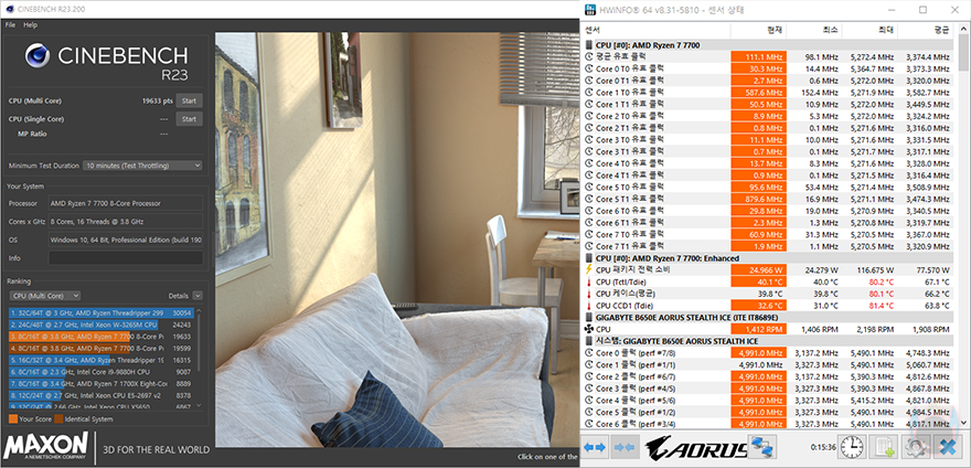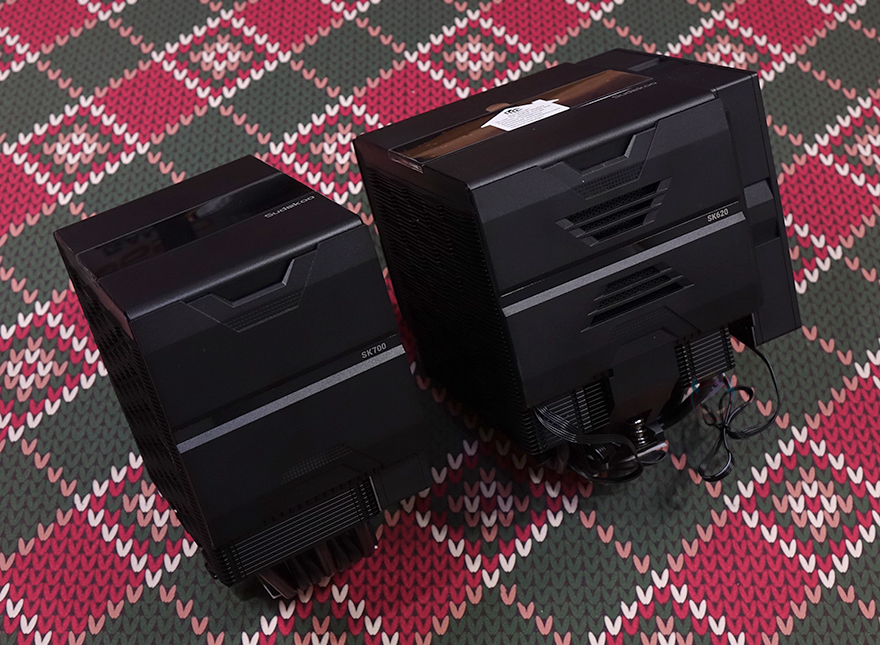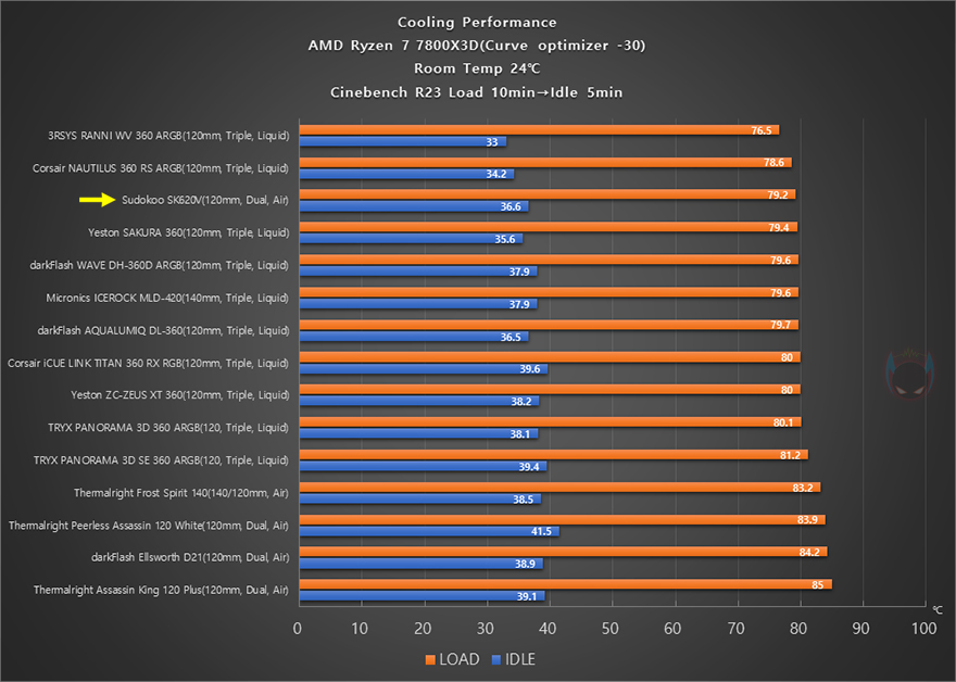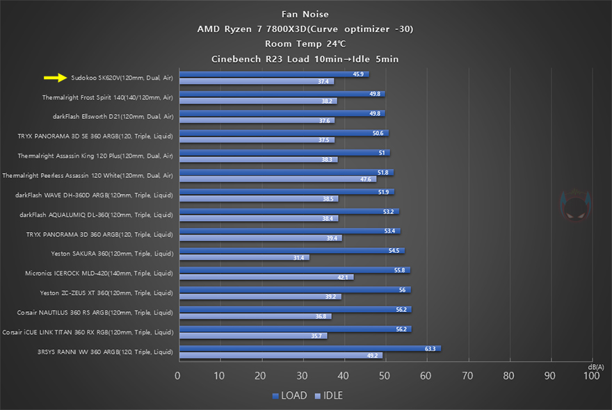 끝으로, 이제 SK620V 쿨러의 냉각 성능을 확인해보는데, 앞서 SK700V는 싱글팬 쿨러였기 때문에 CPU 등급에 제한을 두고 했지만, SK620V은 듀얼 팬 구성의 듀얼 타워로 하이엔드 CPU까지 커버할 수 있습니다. 그래서, 공랭과 수냉쿨러 함께 비교를 위해 AMD 라이젠 7 7800X3D CPU를 사용했으며, 요즘은 수동 오버클럭보다 AMD에서 제공하는 PBO나 커브옵티마이저(-30) 설정을 더 선호하기 때문에 커브옵티마이저 설정에 동일한 써멀그리스를 사용해 진행했습니다. CPU 부하를 줄 수 있는 렌더링 벤치마크 프로그램 씨네벤치(Cinebench) R23을 10분간 Load 상황으로 진행하고, 이후 5분간 Idle로 돌아가는 상황에서 CPU 온도와 팬 소음, 속도를 확인해 봤는데, CPU 온도를 공랭(Air)과 수냉(Liquid) 쿨러 전체 비교해서 SK620V가 상위권 속하는 걸 확인할 수 있었으며, 일부 수냉쿨러보다 더 낮은 온도로 뛰어난 냉각 성능을 자랑했습니다. 그리고, 진행동안 팬 속도와 소음을 측정한 결과 팬은 Load 상황에서 최대 속도에 근접해 작동했으며, Idle 상황 5분 동안에는 1259 RPM까지 떨어져 작동했는데, 소음이 Load와 Idle 모두에 상당히 정숙한 걸 확인할 수 있었습니다. 특히, Load 상황에서 전체 쿨러들 중 가장 조용한 소음을 자랑해 공랭 쿨러의 특성을 잘 보여줬으며, 전체적으로 냉각 성능과 소음 모두 만족스러운 결과를 보여주는 모습을 보여줬습니다.