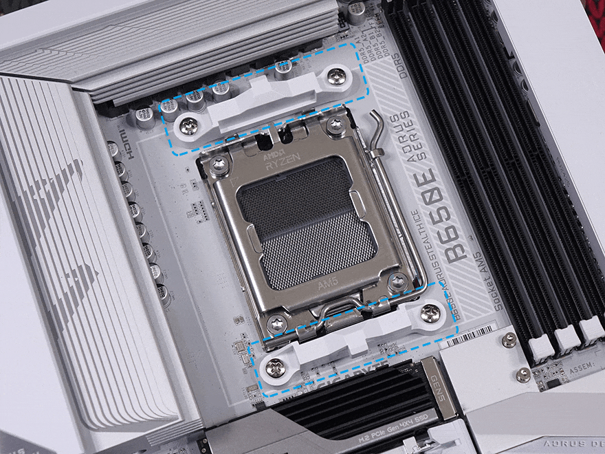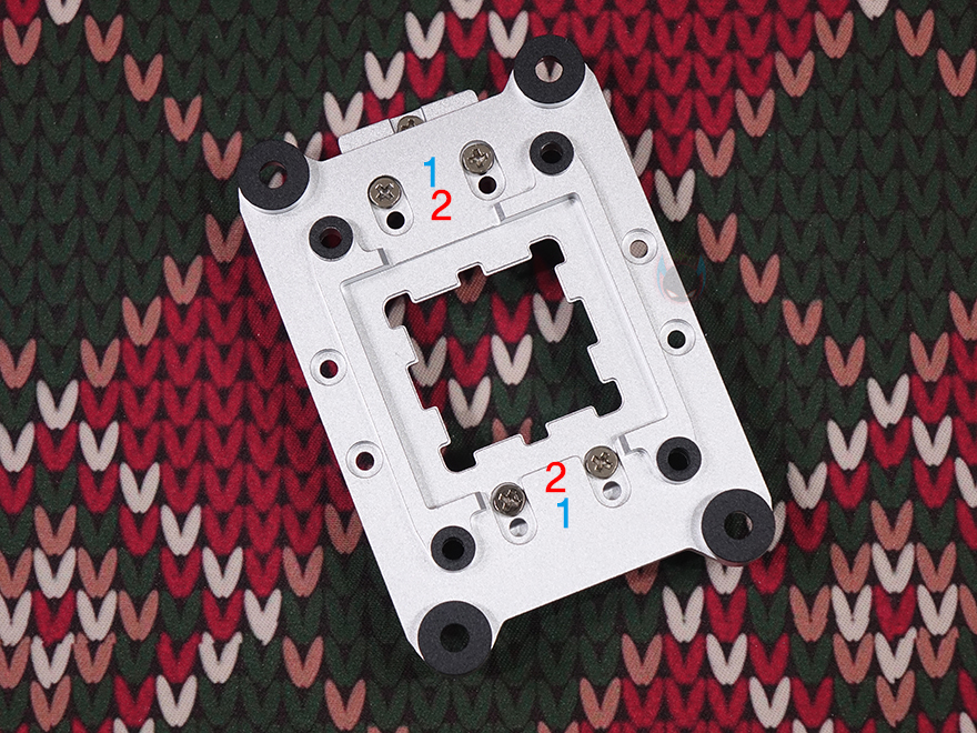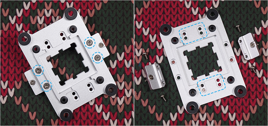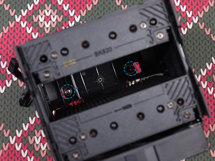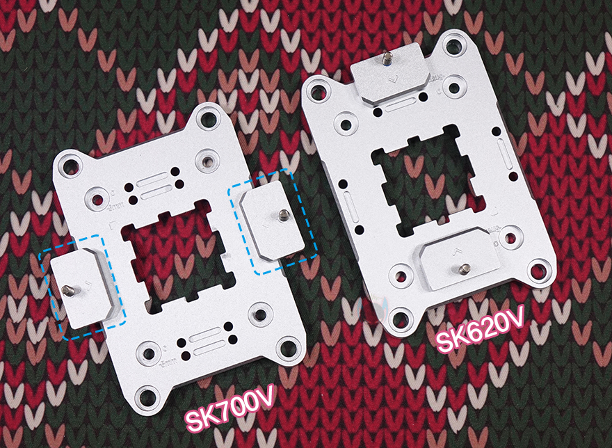 그럼, 이제 SK620V 쿨러를 직접 사용해보는데, 먼저 장착을 하기 전에 이전 시간에 만났던 SK700V 같은 경우에 마운트 키트의 쿨러 체결 나사 부분이 좌우에 기본 위치하고 있어서, SK620V와 호환이 안될 거라 생각할 수 있지만, 나사 위치를 변경할 수 있기 때문에 사실상 마운트키트는 서로 호환이 됩니다. 후면에 고정 나사를 풀면 체결 나사 부분이 분리되고, 체결 나사 부분을 SK620V 마운트키트처럼 상하 위치에 시키면 동일한 형태가 되죠. 그리고, SK620V 같은 경우 듀얼 타워 쿨러이기 때문에 부피가 있어서 일부 메인보드의 히트싱크에 따라 간섭이 발생할 수 있는 부분을 고려해, 체걸 나사 위치 조절도 가능하도록 갖추고 있는데, 상하 위치 모두 기본 위치에서 -5mm로 이동시킬 수 있습니다. 그리고, SK700 시리즈와 SK620 시리즈 모두 출시 때는 AMD AM5 소켓 지원으로만 나왔지만, 최근에 인텔(Intel) LGA1851/1700/1200/1150/1151/1155와 AMD AM4 소켓까지 장착할 수 있는 마운팅 브래킷 키트(Mounting Bracket Kit)가 출시해, 이제 더 범용적으로 사용할 수 있게 되었습니다.