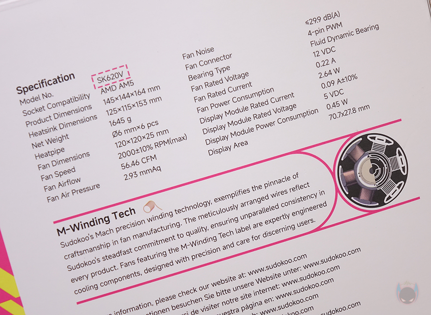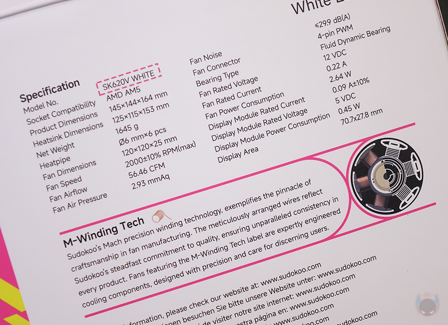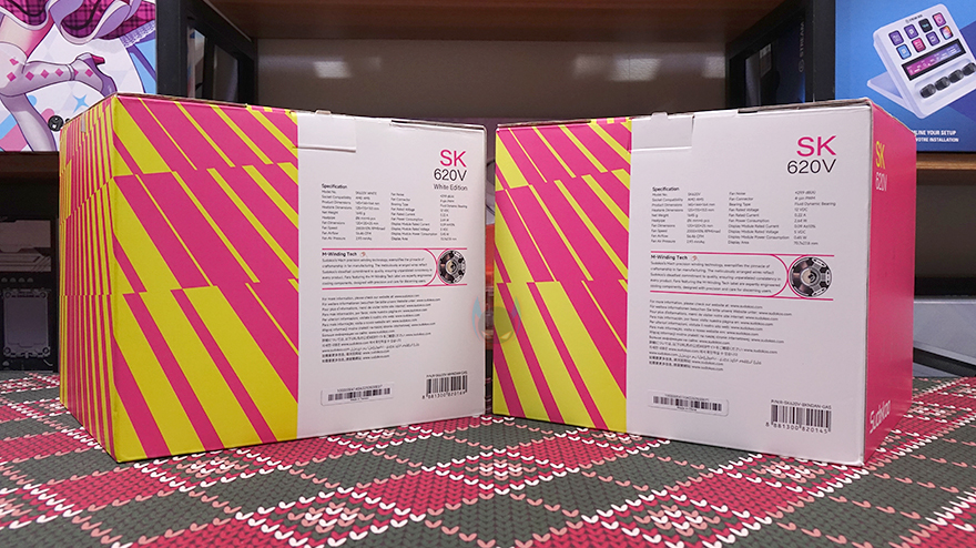 제품박스부터 살펴보면, 박스 디자인은 앞서 만났던 SK700V와 유사합니다. SK620V 역시 박스 전면에 제품 색상에 맞춰 제품 이미지를 담고 있으며, 모델명과 함께 듀얼 타워(Dual Tower), 자사 디지털 스크린 기술인 마스터크래프트(MasterCraft) 표기도 확인할 수 있죠. 제품 이미지를 보면, 싱글팬 타워의 SK700V와 유사하지만, 역시 듀얼 팬 탑재가 뒤로 깊이가 더 길다란 걸 짐작할 수 있습니다. 그리고, 박스 후면에는 제품의 기본 사양 표기를 해놨는데, 역시 사양 표기에서 사이즈와 무게가 SK700V보다 더 크고, 무겁다라는 걸 미리 알 수 있으며, 쿨러에 사용된 팬 역시 SK700와 동일한 M-Winding Tech 베어링 기술이 적용된 제품이라는 걸 사양 표기에서 동일한 내용을 담고 있어 짐작할 수 있죠.