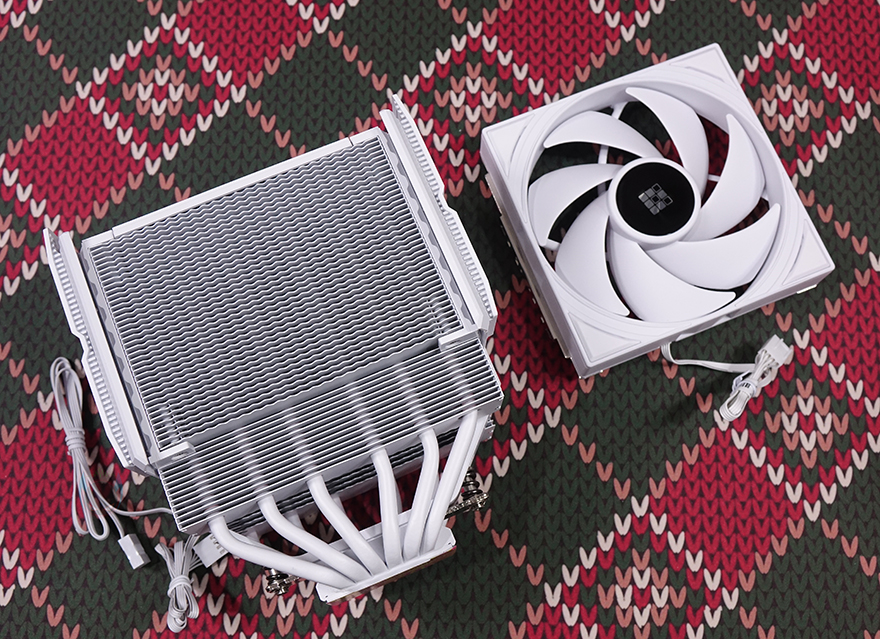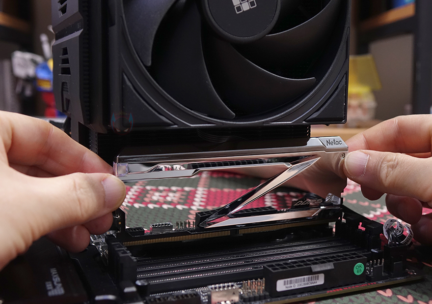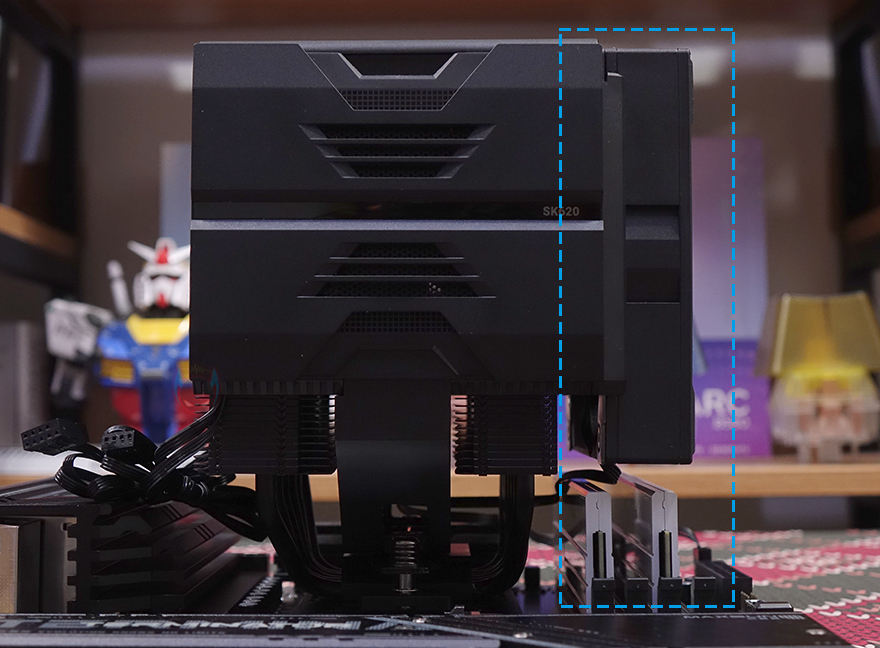 마운트 키트와 소켓 언급은 이쯤에서 마무리하고, SK620V 쿨러를 장착해보는데, 기본 장착 지원은 AMD AM5 소켓으로 AM5 소켓 기준에서 설명하자면, 먼저 AMD 메인보드에 장착된 기본 쿨러 가이드와 소켓 가이드를 분리해 제거합니다. 그리고, 제공되는 마운트 키트를 장착하기 전에 CPU에 써멀그리스를 도포하고, 마운트 키트를 장착해 줍니다. 그다음 쿨러의 상판을 분리해서 마운트 키트 양쪽 나사에 맞춰서 올린 후, 제공되는 공구 드라이버를 사용해 쿨러 내부 중앙에 볼트와 체결해 주고, 상판을 다시 장착해 주면 쿨러 장착 마무리가 됩니다. 경우에 따라선 전면 팬까지 분리하고 장착해도 되면, 전면과 중앙 2개의 팬이 장착되어 있기 때문에 함께 팬 작동을 시키고 싶다면 제공되는 Y자 연장 케이블을 사용하면 됩니다. SK620V는 듀얼 타워 쿨러이기 때문에 다른 듀얼 타워 쿨러들과 마찬가지로 전면 팬이 메모리 슬롯 영역을 침범합니다. 하지만, 앞서 확인했듯이 높낮이 조절이 가능해서, 메모리 방열판 높이에 따라 팬 상하 위치 조절을 할 수 있고, 무엇보다 높낮이 조절이 가능하기 때문에 팬을 분리하지 않은 상태에서 메모리 장착과 분리가 가능해 편리합니다.