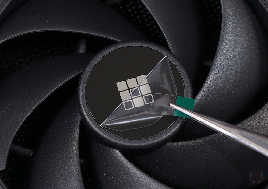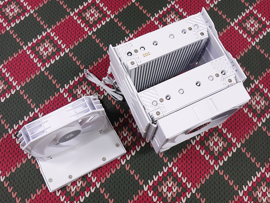쿨러 상단에는 SK700V에서도 확인했던 마스터크래프트(MasterCraft) 프로그램을 통한 실시간 작동상태 모니터링의 디지털 스크린이 적용되어 있습니다. 개봉시 스크린 부분에는 보호비닐이 부착되어 있으며, 보호비닐에는 프로그램 다운로드 안내 주소도 표기해 놨죠. 또한, SK620V 상단 역시 SK700V처럼 상단을 잡고 위로 당기면 슬라이드처럼 분리를 할 수 있습니다. 상단이 분리되면 내부 쿨러 가운데에 배치된 추가 팬도 함께 분리되어서 나오는 걸 확인할 수 있죠. 추가 팬 역시 개봉 시 팬 중앙에 보호비닐이 부착되어 있습니다.