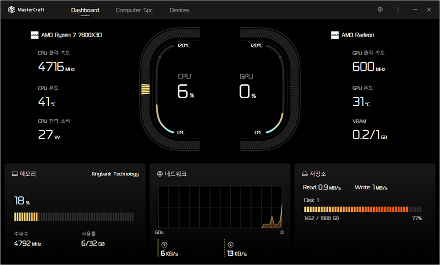 쿨러 장착과 메인보드에 케이블 연결까지 마치면, 이전 시간에 만났던 SK700V와 마찬가지로 SK620V 쿨러에도 쿨러 상단에서 실시간 모니터링할 수 있는 마스터크래프트(MasterCraft) 프로그램을 설치해줍니다. 설치가 정상적으로 완료되면, 프로그램에서 쿨러 장치를 인식하고, 쿨러 상단 디지털 스크린을 통해 시스템 작동상태를 실시간 모니터링 할 수 있습니다. 공용 프로그램이 기 때문에, SK620V 쿨러에서도 디지털 스크린에서 CPU 클럭, LOAD률, 소비전력, CPU 온도를 표시해 주며, 마스터크래프트 프로그램을 통해서는 메모리와 네트워크, 저장장치까지 추가로 모니터링할 수 있고, 시스템 사양과 온도 표시 제한, 팬 속도 표시, 프로그램 업데이트 등을 추가로 다룰 수 있습니다.