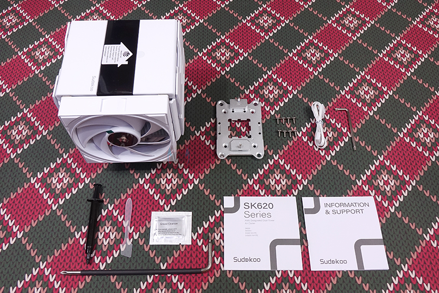 박스 측면에 있는 봉인 스티커를 제거해서, 박스를 열어보면, 오픈 과정에서 SK620V 역시 제품 색상에 따라 제품 이미지를 한 번 더 담고 있으며, 포장은 쿨러 같은경우 외부 충격보호를 위해 우레탄-폼 포장재를 사용했으며, 나머지 구성품들은 별도의 박스에 수납되어 있습니다. 전체 제품 구성에는 SK620V 쿨러, 마운트 키트(Mount Kit), Y자 연장 팬 케이블, 나사, 공구 드라이버 2개, 써멀그리스, 그리스 클리너, 제품설명서, 보증서로 이루어져 있으며, SK620V 역시 제품 색상에 따라 마운트 키트와 나사, 팬 케이블 색상을 통일시켰습니다.