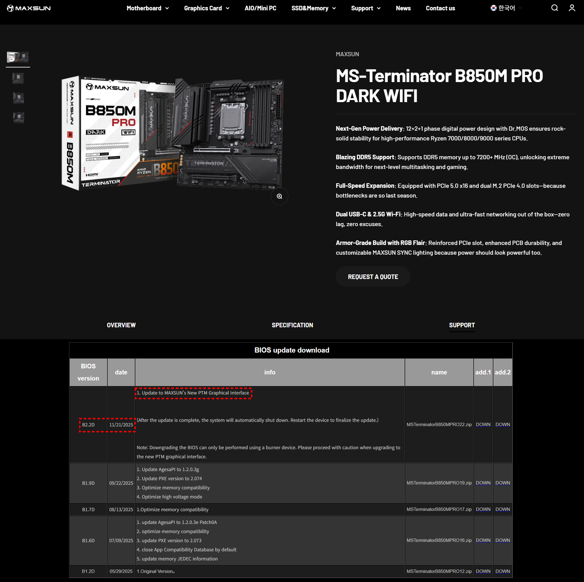 일단, 맥선에서 공식 보도자료로 자사 AMD 800 시리즈 메인보드에 PMT 바이오스 적용 모델 리스트도 공개했는데, 11월부터 출시한 X870/B850 메인보드에는 기본적으로 PMT 바이오스가 적용되어서 출시된다. 반대로, 11월 이전에 출시한 메인보드는 바이오스 업데이트를 통해 적용해야하는데, 사실상 맥선이 11월 이전에 출시한 AMD 메인보드는 B850밖에 없다. 물론, B650 메인보드에서도 PMT 바이오스 적용 계획을 밝혔고, 11월부터 B850과 B650 일부 메인보드에 PMT 바이오스 업데이트 파일이 등록되기 시작했다.