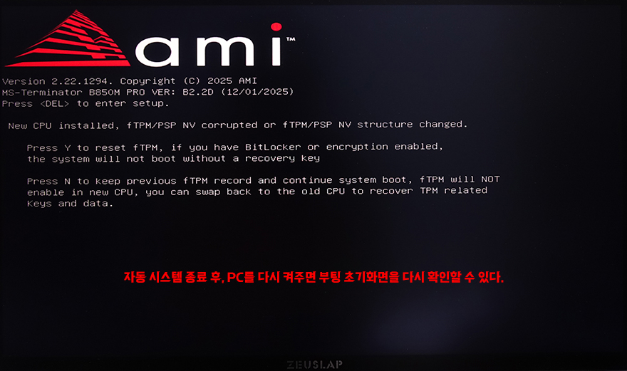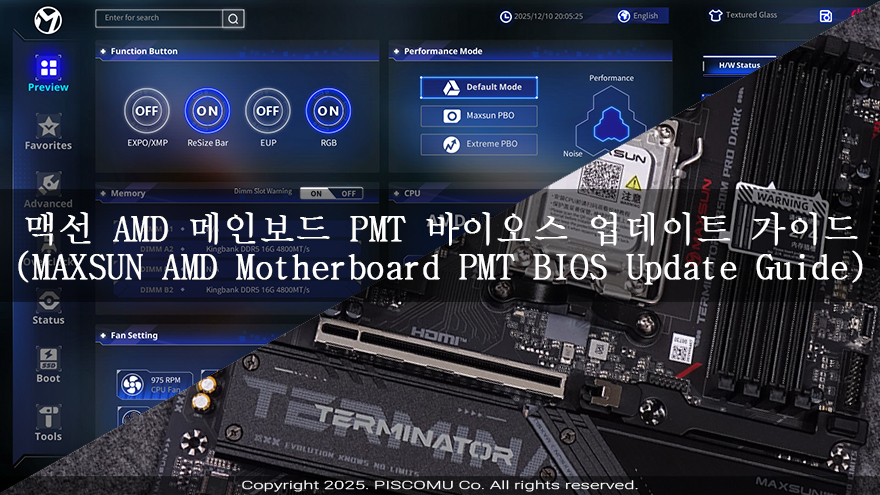 피스커뮤가 그동안 리뷰로 접한 맥선의 AMD 메인보드는 TERMINATOR B850M PRO DARK WIFI(https://piscomu.com/315108)와 eSport B850ITX WIFI ICE(https://piscomu.com/315097) 2가지 모델이며, 이 중 TERMINATOR B850M PRO DARK WIFI 메인보드가 11월 21일자로 PMT 바이오스 업데이트 파일이 등록되었다. 그래서, 이번 시간에는 TERMINATOR B850M PRO DARK WIFI 메인보드처럼 11월 전에 출시한 메인보드에 PMT 바이오스 업데이트 진행을 해보려고 한다. 참고로, PMT 바이오스가 적용된 상태에서 바이오스 업데이트 가이드를 지난 시간에 올렸으니 참고하기 바란다.