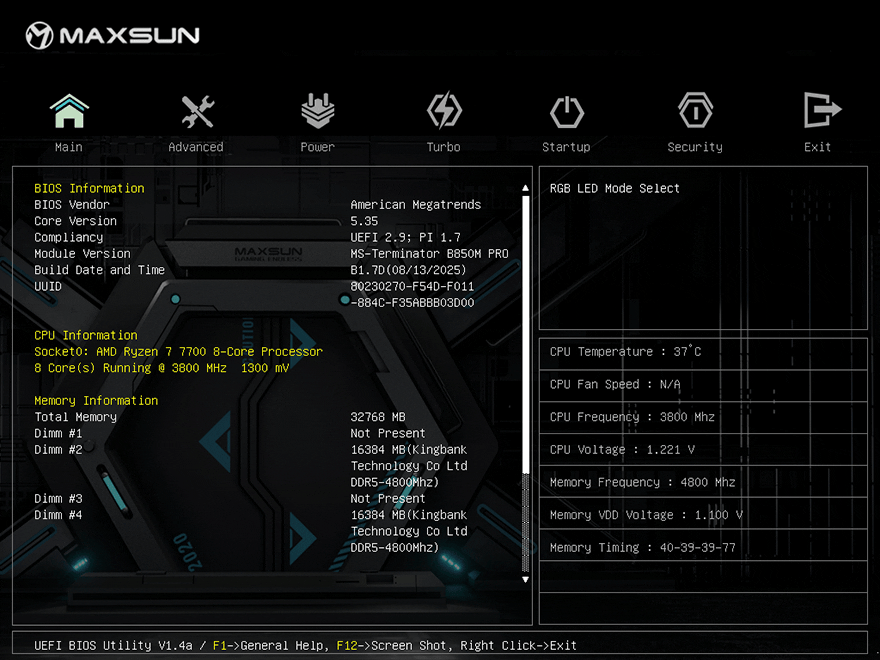 일단, PMT 바이오스로 업데이트 하기전에 TERMINATOR B850M PRO DARK WIFI 메인보드에 기존 바이오스 인터페이스 즉, CMOS를 잠깐 살펴보면, 기존 DOS 같은 인터페이스의 EFI에서 벗어나 커스텀 그래픽이 적용된 UEFI 디자인을 가졌지만, 메이저 브랜드보다 해상도가 낮고, 무엇보다 바이오스 업데이트 방식이 CMOS 안에서 지원되지 않고, 기존 EFI에서 진행하던 shell 방식으로 진행된다. 쉽게 말해, 완전히 UEFI로 전환된 게 아니다. 올해 맥선(MAXSUN)이 선보인 PMT 바이오스는 바로 이 UEFI로 완전히 넘어온 고화질의 인터페이스와 CMOS 안에서 바이오스 업데이트를 지원한다.