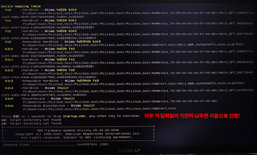 다시 본론으로 돌아와, 11월 이전에 출시한 AMD 800시리즈 중 PMT 바이오스 업데이트 파일이 등록된 TERMINATOR B850M PRO DARK WIFI 메인보드를 이제 PMT 바이오스로 업데이트 해보는데, 먼저 홈페이지에서 PMT 인터페이스로 적용되는 최신 바이오스(B2.2D)를 다운로드 받아 압축파일을 풀어서, USB 메모리로 옮긴다. USB메모리는 바이오스 업데이트 파일 외에 다른 외부 파일이 없는 게 좋다. 왜냐하면, 앞서 언급했듯이 EFI Shell 방식으로 업데이트 진행되기 때문이다. 그리고, USB 메모리 파일 시스템 포맷도 FAT 32로 적용해야 한다. USB 메모리에 업데이트 파일을 담았으며, 메인보드 후면 USB 포트에 꽂고, DEL키를 눌러서 CMOS에 진입한 후, FLASH write protection function이나 ME protection function 항목이 있다면, 비활성화(Disabled)를 시켜주고, USB 메모리로 부팅을 시켜준다. 그럼, USB 메모리로 부팅이 인식되면, EFI Shell 화면이 뜨고, 알아서 자동으로 업데이트 진행이된다. 아무 키 입력 없이 가만히 놔두면 알아서 자동으로 진행하고, 마무리가 되면 자동으로 시스템 전원을 종료한다. 자동 진행 후 시스템 종료까지 마치면, 사용자는 다시 PC 전원을 켜주면 되고, 이때 DEL키를 눌러서 CMOS로 들어가보면 PMT 인터페이스가 적용된 새로운 바이오스 UI를 확인할 수 있다. 참고로, UI 인터페이스까지 완전히 바뀌는거라 평소 바이오스 업데이트보다 좀 더 진행 시간이 소요된다.
