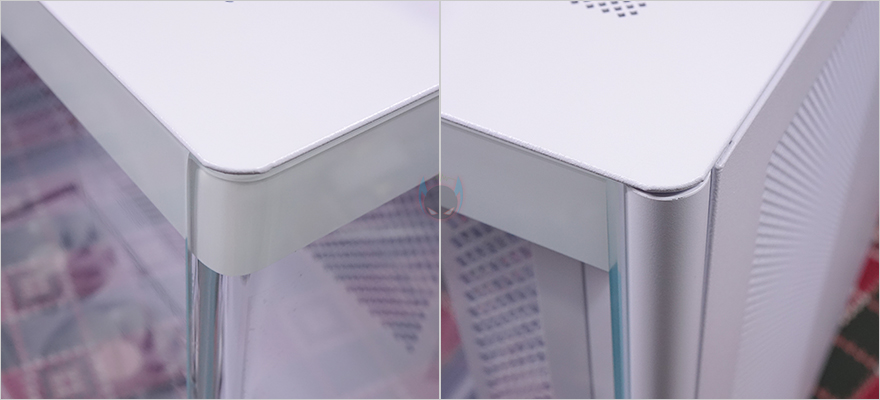 부위별로 좀 더 자세히 살펴보면, 전면은 컴퓨터 어항케이스 특성답게 강화유리 패널을 적용하고 있습니다. 또한, 자사의 King 시리즈에서 보여줬던 양쪽 모서리 몰딩 디자인은 HS시리즈에서도 그래도 적용하고 있는데, 왼쪽은 측면 강화유리 패널과 만나는 지점까지 곡면 강화유리로 적용했으며, 오른쪽은 프레임으로 곡면 처리를 했습니다. 그리고, 전면 아래에는 버튼 및 포트가 배치되어 있는데, 가운데 전원버튼을 기준으로 양쪽으로 마이크/오디오 포트, USB-C와 리셋버튼, 그리고, USB 3.0 타입 A포트가 양쪽에 배치되어 비례를 맞추고 있습니다. 그래서, 전면 전체를 보면 좌우 대칭에 상당히 신경 썼다는 걸 느낄 수 있는데, 그 이유는 뒤에서 확인할 수 있습니다.