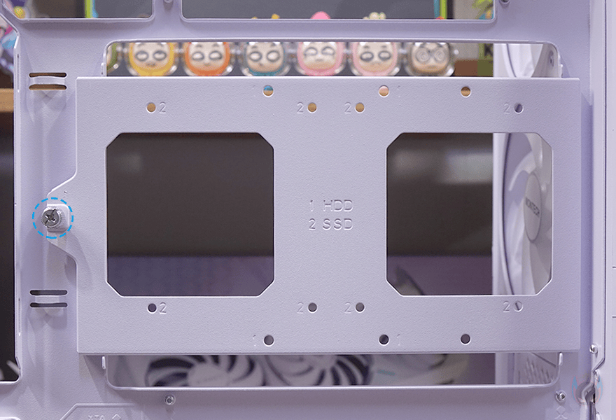 메인보드 트레이 후면 공간은 트레이 전면처럼 케이블 정리를 가려주는 커버들이 적용되어 있습니다. 먼저 트레이 윗부분에 커버는 커버 윗부분 중앙에 배치된 고정 나사를 풀면 쉽게 분리가 되고, 플라스틱 재질입니다. 커버를 분리하면, 팬과 ARGB 컨트롤의 허브가 기본 장착된 걸 확인할 수 있는데, 각각 6개씩 커넥터가 배치되어 있습니다. 그리고, 파워서플라이가 장착되는 전면쪽에 커버 역시 윗부분에 고정 나사를 풀면 쉽게 분리가 되고, 커버 윗부분은 파워서플라이 내부 팬 위치에 맞춰서 쿨링효과를 볼 수 있도록 에어홀 처리를 해놨죠. 또한, 분리된 커버 안쪽 아래에는 3.5인치 HDD 1개 또는 2.5인치 SSD/HDD 2개를 장착할 수 있게 나사홀이 처리되어 있습니다. 그리고, 파워서플라이 자리는 보면 상단에 고정 나사를 확인할 수 있는데, 고정 나사를 풀면 파워서플라이 브래킷을 분리할 수 있습니다. 브래킷은 ATX와 SFX 규격에 따라 파워서플라이를 장착할 수 있게 해 주죠.