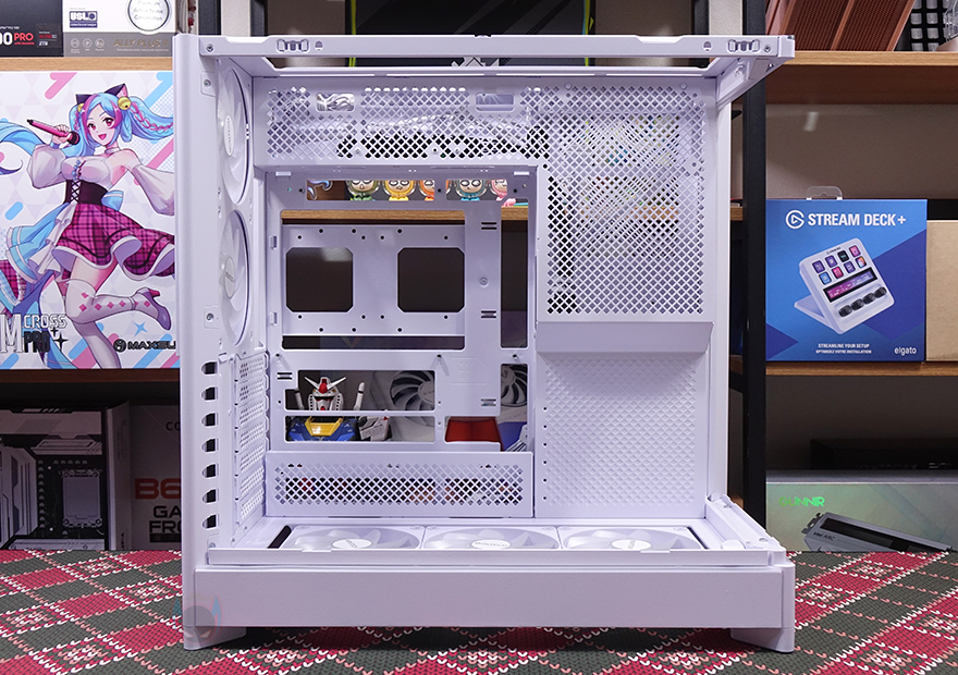 상단 패널을 분리하면, 앞서 확인한 전면 강화유리 패널을 분리할 수 있습니다. 전면 강화유리 패널 역시 무나사 방식의 볼-헤드핀 클램프를 적용했으며, 패널 상부를 열 때 낙하방지를 위한 하부 걸쇠 장치도 적용되어 있죠. 그리고, 왼쪽 측면 강화유리 패널 역시 상단 패널이 분리된 상태에서 분리할 수 있으며, 역시 볼-헤드핀 클램프와 낙하방지의 걸쇠 장치가 적용되어 있습니다. 오른쪽 측면 패널은 새시 패널로 내부 측면 쿨링효과를 위해 패널 앞자리에 상단패널처럼 사각 디자인의 에어홀을 적용했으며, 새시 패널 역시 무나사 방식의 볼-헤드핀 클램프를 적용했지만, 하부에는 낙하방지 걸쇠가 없기 때문에 분리 시 끝까지 잡고 분리시켜야 합니다.