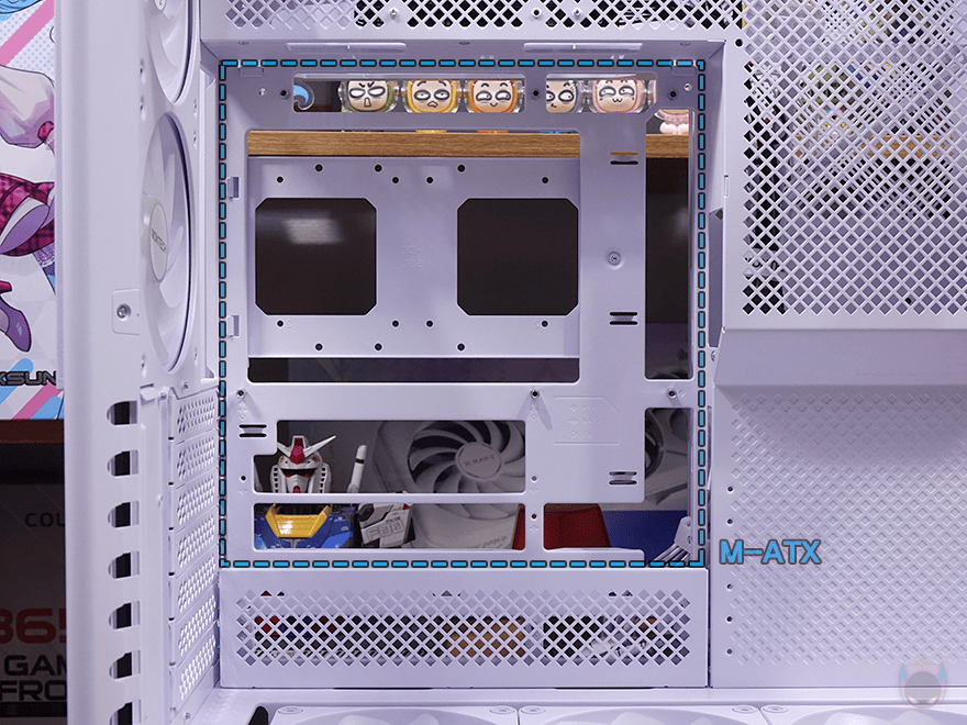 이제 몬테크의 HS02 PRO PC케이스 내부를 살펴보는데, 먼저 메인보드가 장착되는 트레이 부분에는 CPU-컷-아웃과 주변으로 일명 BTF라 부르는 백-커넥터 메인보드를 지원하도록 커넥터-홀 처리를 해놨습니다. 또한, 트레이 아랫부분에는 커버를 적용해 놨는데, 바로 M-ATX 폼 규격의 메인보드를 장착했을 때 내부 빈 공간을 가려주는 역할로 커버를 분리하면, ATX 메인보드까지 장착할 수 있습니다. 그리고, 파워서플라이가 전면 쪽에 배치되는 만큼 트레이 후면 공간이 트레이 전면에서 봤을 때 난잡하게 보이지않도록 케이지 디자인의 커버를 적용했으며, 그래픽카드가 장착되는 위치쯤에는 제공되는 그래픽카드 지지대를 장착할 수 있게 나사홀을 처리해놨습니다. 특히, 지지대를 바같쪽이 아닌 안쪽에 장착되도록해서 시각적 방해도 줄이도록 했죠. 당연히 나사홀이 여러개라 위치조절이 가능하고, 지지대 상태에서도 약간의 상하조절이 가능합니다. 그리고, 내부 하단에는 앞서 외부에서 확인한 하단 쿨링시스템의 120mm 팬을 다시 확인할 수 있는데, 흡입 역할의 리버스 팬이며, 후면과 하단 팬 모두 ARGB 팬입니다. 또한, 방금 확인한 메인보드 트레이 아래 커버를 분리했을 때, 선정리홀도 추가로 있는걸 확인할 수 있고, 뒤에서 확인하겠지만, 전면 강화유리와 측면 강화유리 라인을 따라서 RGB 라이트닝 효과를 볼 수 있게 LED 스트립도 장착된걸 확인할 수 있습니다.