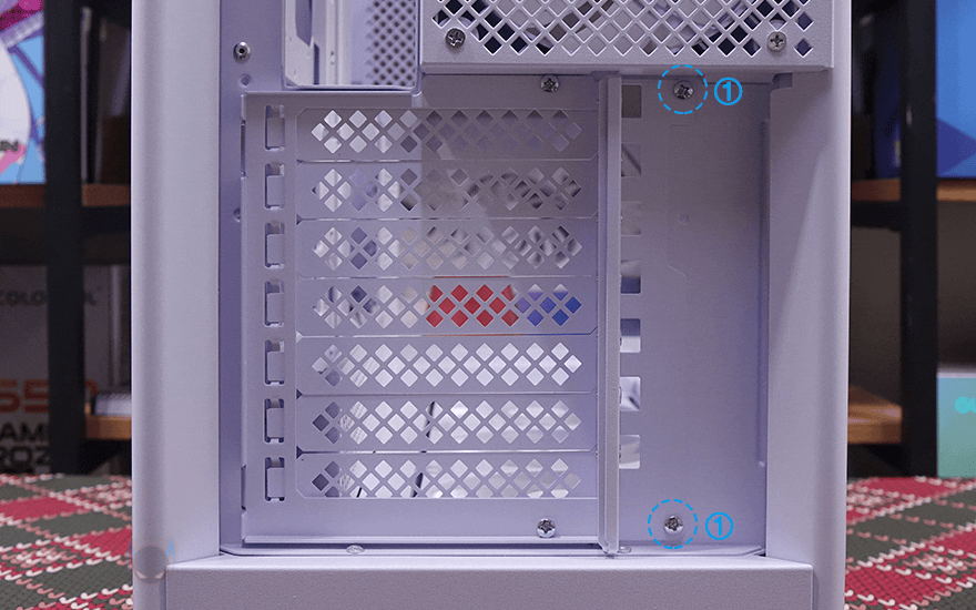 케이스 후면을 살펴보면, 후면 역시 일반적인 미들타워와는 조금 다릅니다. 일단, 후면 배기를 위해 사각 디자인의 에어홀이 처리되어 있는데, 내부에 배기 역할로 장착되는 팬이 일반 미들타워에서는 1개인 경우가 많지만, HS02 PRO는 2개를 장착하고 있죠. 이는 앞서 잠깐 확인한 파워서플라이 위치가 일반적인 하단 배치가 아니고 내부 앞쪽에 배치하면서 공간을 확보했기 때문입니다. 또한, 팬이 장착된 부위는 상단 패널을 분리하고, 상단에 있는 고정 나사를 풀면 브래킷처럼 분리할 수 있는 구조이죠. 또한, 브래킷을 분리해 보면, 일반적인 25T 두께의 팬보다 더 두꺼운 팬을 브래킷을 사용하지 않고 장착할 수 있게 안쪽 내부에도 나사홀을 처리해 놨습니다. 그리고, 아래 PCI 슬롯은 미들타워 기준인 7개를 갖추고 있는데, PCI 슬롯 부분 역시 주변에 고정된 나사를 순서대로 풀면, PCI슬롯 전체 구간을 브래킷처럼 분리할 수 있습니다. 물론, 90˚ 회전 장착까지 지원해 수직 방향으로 그래픽카드를 장착할 수 있게도 지원하죠. 또한, PCI 슬롯 가이드도 재사용이 가능한 착탈식입니다.