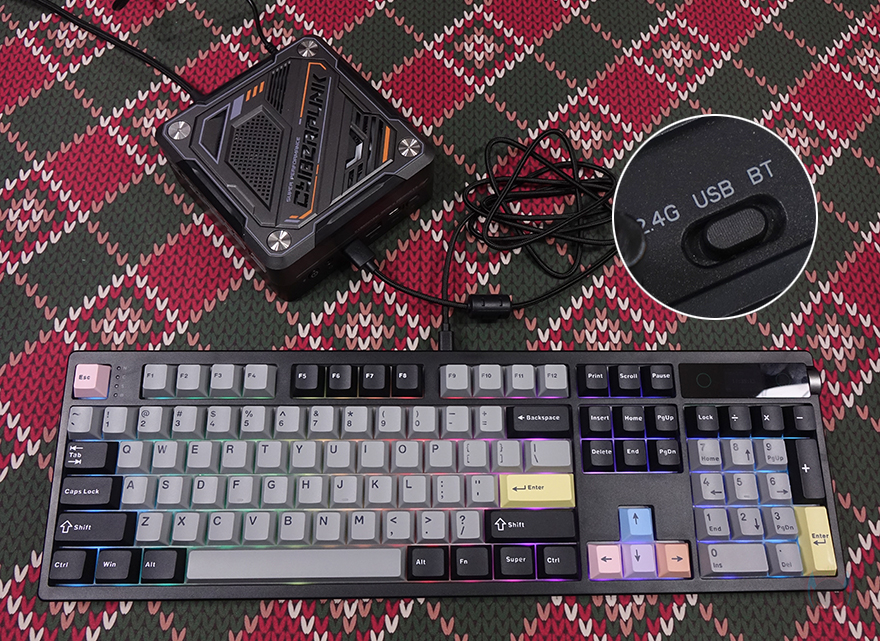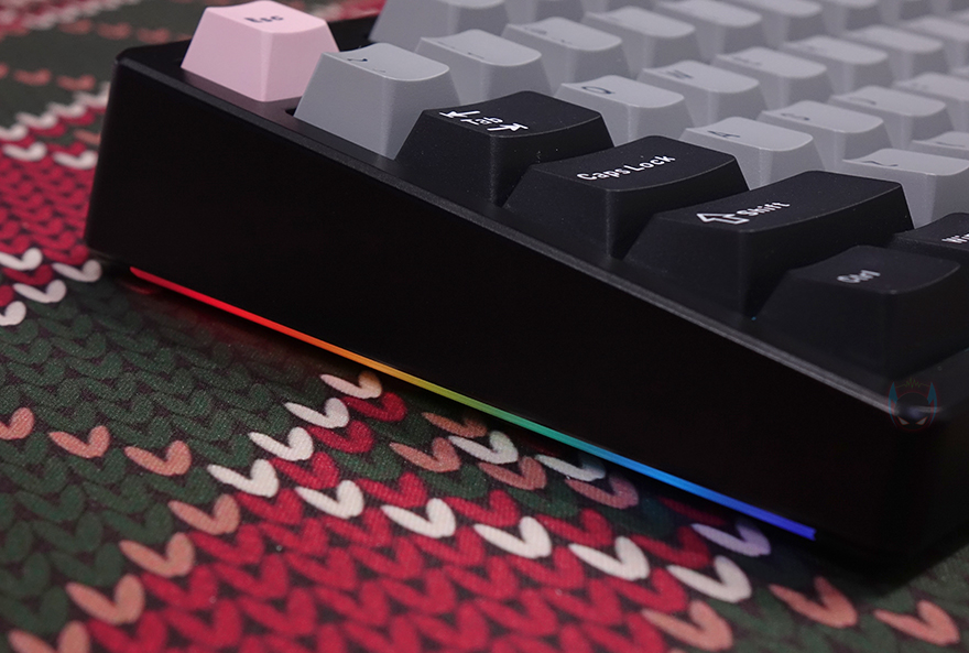 TH108 프로 키보드 역시 Fn키 조합의 부가 기능들을 지원하는데, 다른 키보드에서도 일반적으로 적용하는 부가 기능과 비슷해 익숙하게 바로 사용할 수 있습니다. F1~F12키까지는 화면밝기조절부터 미디어 재생 컨트롤, 볼륨조절 기능을 지원하고 있으며, QWER키는 블루투스와 무선 2.4G 연결모드, RGB 백라이트 기능은 특수키와 방향키에서 다루죠. 이 밖에 숫자키패드 위치의 키보드 맨 오른쪽 아래에는 EPOMAKER 로고를 새겨놨으며, 키보드 전면 중앙에는 윈도우/MAC 레이아웃 전환과 유선 연결의 USB-C 포트, 블루투스와 무선 2.4G 모드 전환 스위치가 배치되어 있고, 키보드 밑바닥 부분에는 이전 TH108과 동일하게 양쪽 측면아래로 RGB 라이트닝 효과를 볼 수 있게 디자인이 적용되어 있습니다. 또한, 각 모서리 부근에는 미끄럼방지 패드가 기본 부착되어 있으며, 앞부분에는 높낮이 조절 받침대가 2단계로 적용되어 있고, 각 받침 부분에도 패드가 부착되어 있죠. 참고로, 오른쪽 받침대 아래에는 무선 2.4G 연결모드시 사용되는 동글이 수신기가 수납되어 있습니다. 그리고, 키보드 측면에서 보면 타이핑에 최적화인 스텝-스컬처 2 단계 배열을 적용하고 있으며, 높낮이 받침대 조절을 통해 6/8/10.5˚ 각도조절을 할 수 있죠. 끝으로, 유선 및 충전 시 사용되는 USB 케이블은 전체 슬리빙 처리와 함께 USB-A to C 인터페이스를 가졌으며, PC 및 기기와 연결되는 USB-A 쪽에는 신호손실 최소화를 위해 노이즈 필터가 적용되어 있습니다.