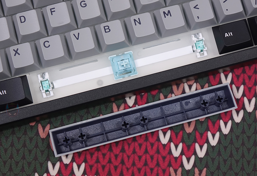 좀 더 자세히 살펴보면, 키캡은 PBT 재질로 이전 TH108에서는 투톤 컬러였던 반면, TH108 프로에서는 투톤 컬러에 추가로 포인트 키캡을 더했습니다. 조금 아쉬운 점이라면 투톤 컬러 키캡의 글자는 이중사출 방식이지만, 포인트키캡은 단순 인쇄로 처리되어 있죠. 그리고, TH108 프로 키보드는 저소음의 Sea Salt Silent Switch와 리니어 타입의 Creamy Jade Switch 2가지 스위츠 중에 선택할 수 있으며, 모두 기본 윤활처리가 되어 있고, 스위치 분리를 할 수 있는 핫스왑 방식으로 적용되었기때문에 다른 스위치로도 장착 호환 사용이 가능합니다. 그리고, 스위치 아래에 RGB 백라이트 지원 LED는 남향(South-Facing)으로 배치되어 있으며, 스위치만 분리해도 일부 흡음재가 적용된 걸 확인할 수 있는데, PC 플레이트 바로 아래 포론 샌드위치 폼이 적용되었고, 그 아래 PCB기판 위아래로 폼과 패드, PCB와 위에 폼 사이에는 PET 필름, 맨 아래 키보드 하판 케이스 내부에는 실리콘 패드까지 타이핑 소음을 최대한 줄일 수 있도록 적용되었습니다. 또한, 스페이스-바 같은 긴 키들의 스테빌라이저는 체리식으로 적용했으며, 스페이스-바 같은 경우에는 중간 빈 공간에도 패드를 적용했죠.
