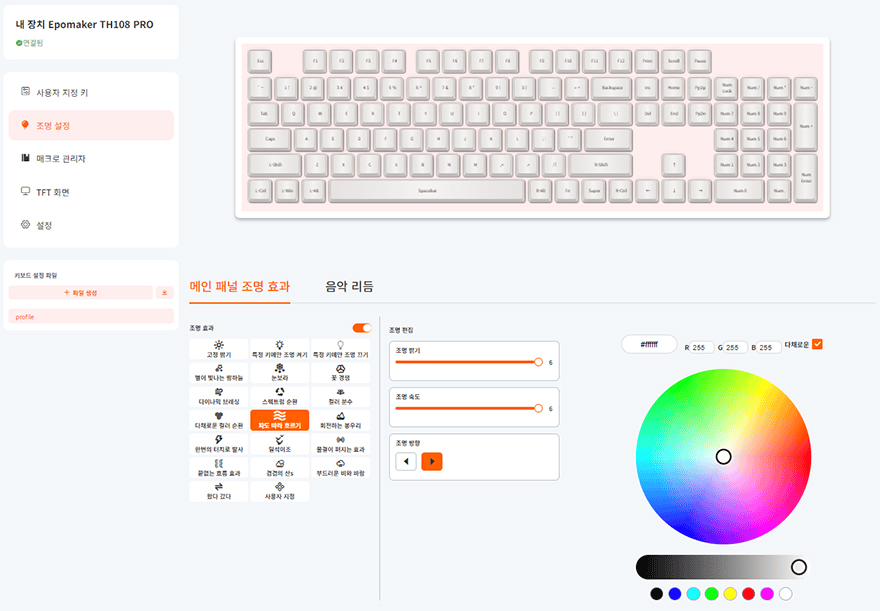 그리고, TH108 프로 키보드의 소프트웨어 지원 같은경우 따로 프로그램을 설치하지 않고, 웹(https://epomaker.driveall.cn/#/) 기반에서 바로 사용할 수 있게 지원하고 있습니다. 유선 사용 시 에포메이커의 웹기반 소프트웨어로 접속해 장치추가로 인식된 TH108 PRO 키보드를 선택하면, 해당 키보드에서 다룰 수 있는 기능들이 나오죠. 한국어 지원도 기본 갖추고 있기 때문에 다루기가 편리하며, 기능에는 사용자지정 키부터 백라이트의 조명 설정, 매크로, LCD 스크린의 TFT 화면 설정, 그리고 펌웨어 업데이트 등의 기본 설정을 지원하고 있습니다. 참고로, 조명 설정에서는 추가로 사용자 지원의 백라이트 설정을 할 수 있고, TFT 화면 설정에서는 LCD 스크린 화면에 사용자가 애니메이션 GIF 파일을 추가로 적용할 수 있죠.