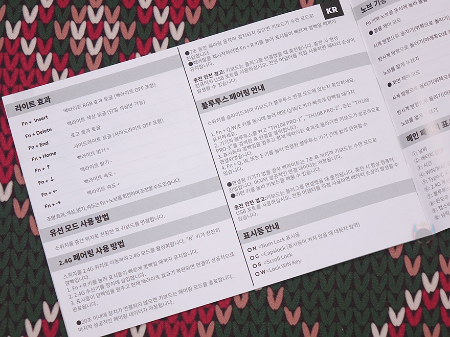 박스를 열어보면, 키보드 비닐 포장과 함께 기본 키보드 덮개로 사용할 수 있는 루프(Roof)가 제공되는걸 확인할 수 있으며, 전체 제품 구성에는 TH108 프로 키보드, USB 전원 및 충전케이블, 여분의 키 스위치 2개, 키캡&스위치 풀러, 루프, 제품 설명서로 이루어져 있습니다. 참고로 제품 설명서에는 한국어도 포함되어 있죠.