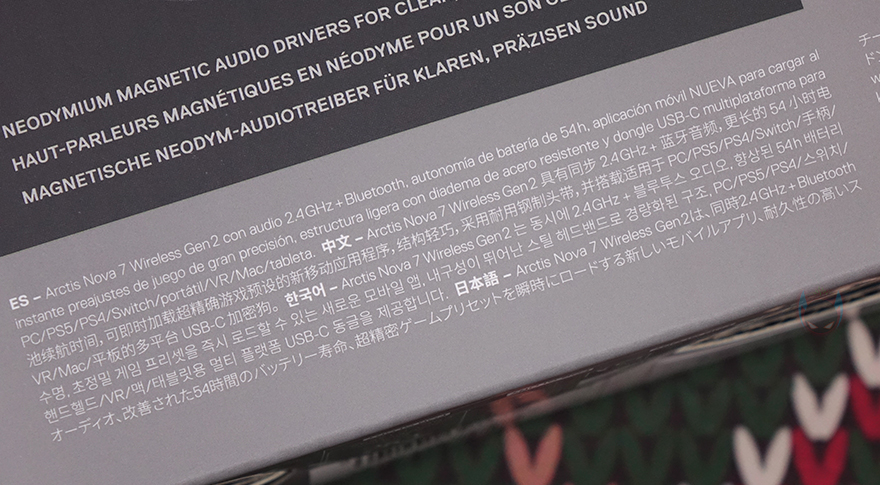 제품 패키지부터 살펴보면, 박스형태의 포장으로 스틸시리즈는 자사 게이밍 헤드셋 제품 박스에 늘 해당 제품 이미지를 담습니다. 그래서, ARCTIS NOVA 7 Wireless Gen2 모델 역시 박스 전면에 색상별로 제품 이미지를 담고 있는데, 이미 2022년도에 출시한 ARCTIS NOVA 7 1세대 모델을 알고 있다면, 2세대에선 새로운 색상이 추가되었다라는걸 짐작할 수 있죠. 뒤에서 다시 언급하겠지만, 1세대에서 블랙, 화이트 기본 2가지 색상이었던 부분에서 이번 2세대에서는 핑크 색상 '마젠타'가 추가되었습니다. 그리고, 모델명 표시 옆에는 2세대 Gen2 표기도 확인할 수 있죠. 박스 한쪽 측면에는 1세대에서 평가받았던 ARCTIS NOVA 7 어워드 표기를 해놨으며, 반대쪽 측면에는 제품 구성품 목록과 기본 사양 표기를 해놨는데, 역시 1세대 제품을 잘 알고 있다면, 2세대에서 배터리 사용 시간이 늘어났다는 점을 쉽게 파악할 수 있습니다. 또한, 박스 후면에는 주요 특징 4가지를 언급하는데, 무선 2.4G와 블루투스 지원, 네오디뮴 마그네틱 유닛, 제품 품질 기존 유지와 새롭게 추가된 앱 연동 지원을 확인할 수 있습니다.