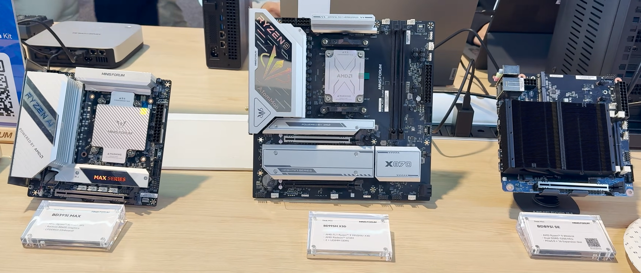 이 밖에도 작년 컴퓨텍스 2025에서 처음으로 공개했던 FL1 소켓 타입의 모바일프로세서(APU)를 탑재한 데스크탑 메인보드 이번에 좀 더 라인업을 갖추어서 공개했는데, M-ATX 타입의 BD995M X3D 메인보드는 Ryzen™ 9 9955HX/3D APU를 탑재하면서, 데스크탑 DDR5 메모리 슬롯 2개를 갖추고, PCIe 5.0x16 슬롯과 M.2 SSD를 갖추고 있습니다. 또한, 처음으로 Mini-ITX 타입의 메인보드 BD395i MAX도 공개했는데, AMD Ryzen AI Max+ 395 CPU와 128GB 용량의 LPDDR5X 메모리를 탑재, PCIe 5.0x16 슬롯, M.2 SSD 슬롯을 갖췄다. 한편 앞으로 출시될 제품들 역시 피스커뮤를 통해서 리뷰로 만나볼 수 있을 예정이다.
