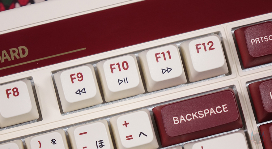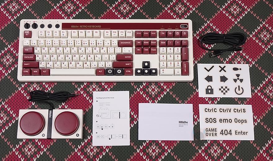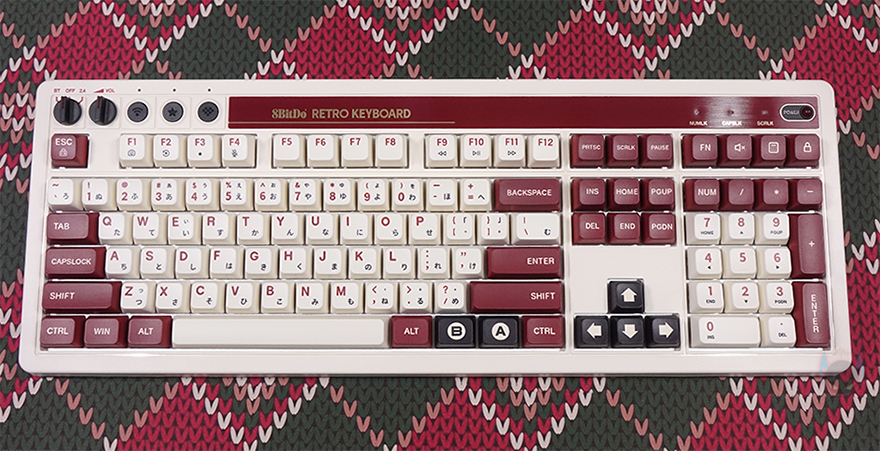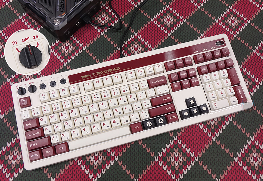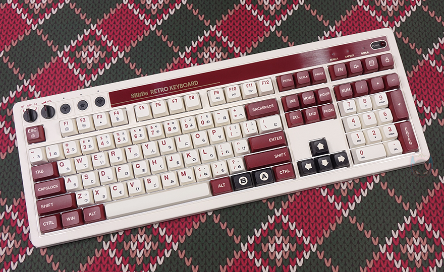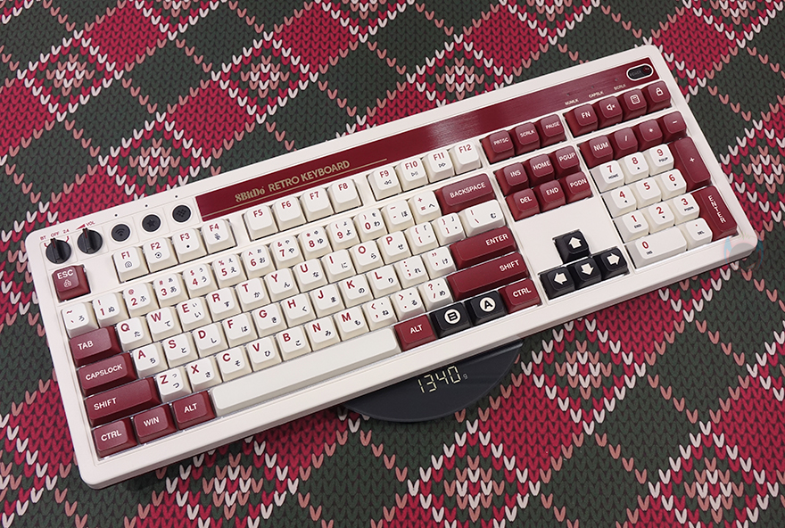 본격적으로 8BitDo의 레트로(Retro) 108 키보드를 살펴보면, 앞서 잠깐 언급했듯이 디자인은 2가지 콘셉트로 출시했습니다. N 에디션과 F 에디션으로 구분되는데, 둘 다 레트로 감성 디자인을 가졌죠. 특히, F 에디션은 닌텐도의 옛날 패밀리컴퓨터 콘솔에서 영감을 얻어 특유의 아이보리(ivory)와 붉은빛의 레드브라운(Red-brown) 컬러가 적용되었습니다. 그리고, 닌텐도 원산이 일본이라 자판에는 일본어도 적용되었죠. 또한, 키보드 배열 맨 윗자리에 모델명을 기준으로 맨 왼쪽에는 유무선 연결모드 스위치와 볼륨조절 다이얼, 페어링 키, 매핑 키, 프로파일 키가, 맨 오른쪽에는 레트로 감성의 전원 LED를 적용해서, 전체적으로 패밀리컴퓨터 영감을 키보드에 잘 녹여냈습니다. 그리고, 키보드 무게도 약 1.3kg대로 묵직한 편이죠.