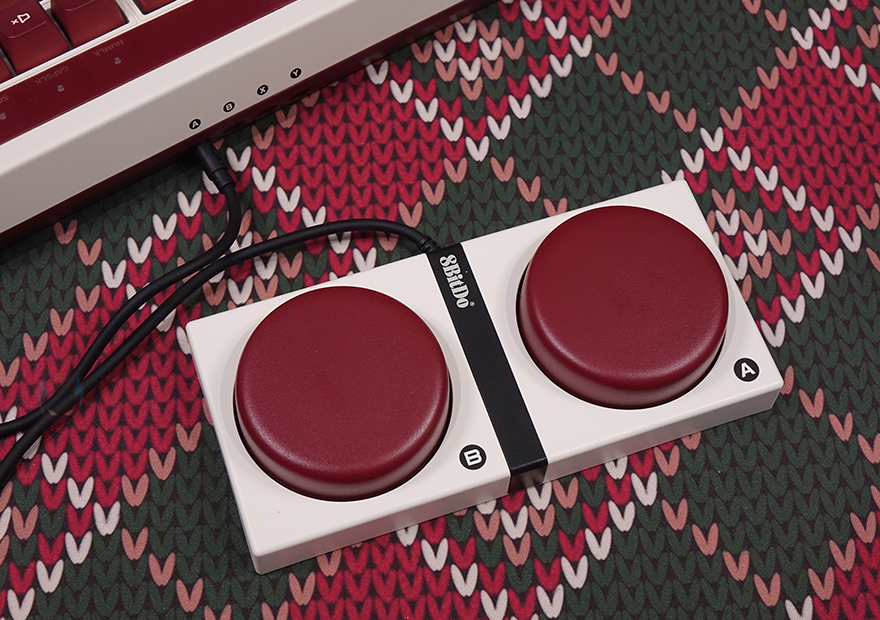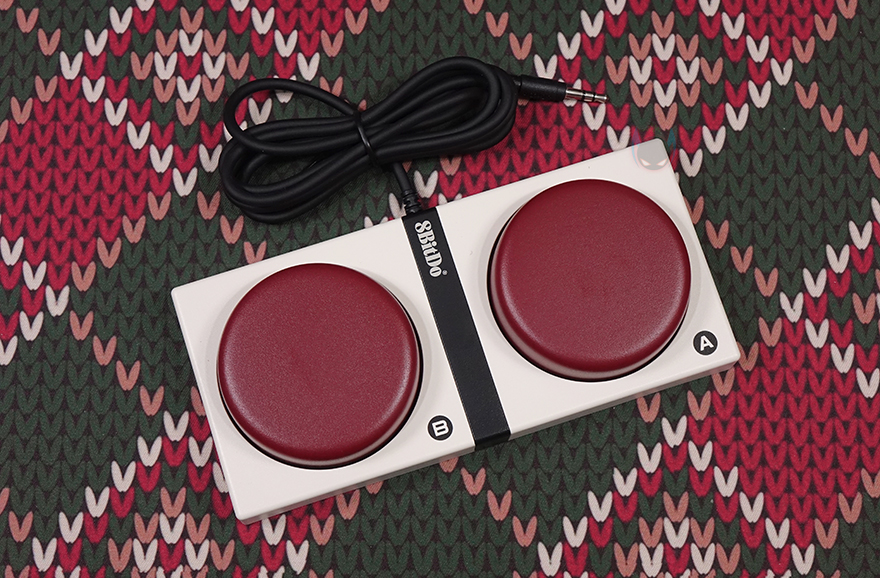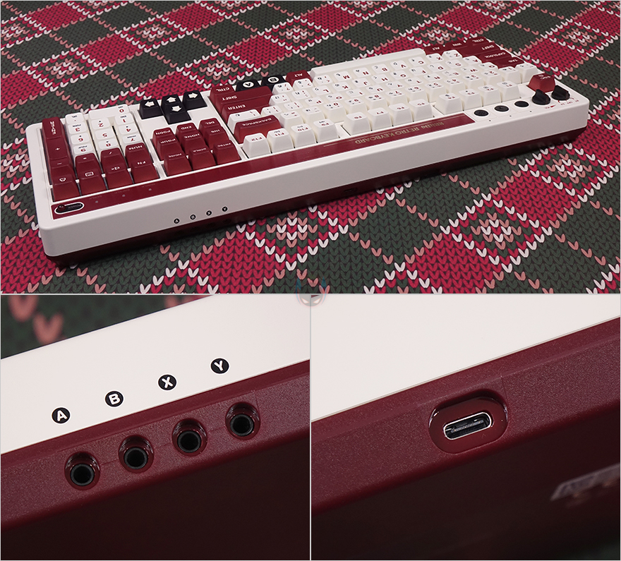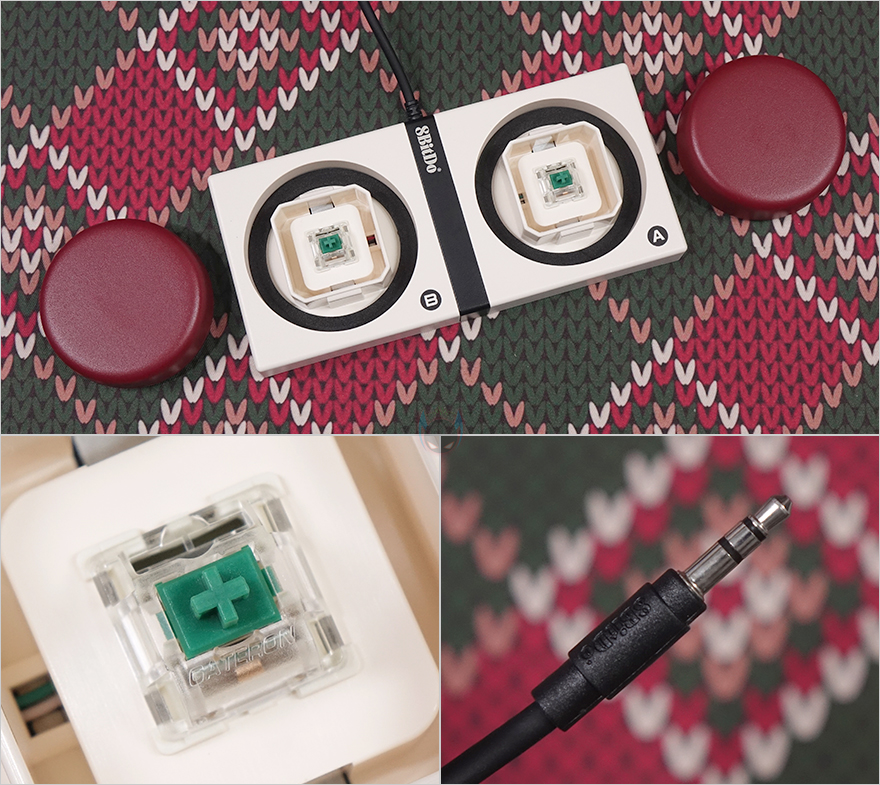 끝으로, 일반 키보드에서 볼 수 없는 오직 레트로 108 키보드에 제공되는 듀얼 슈퍼 버튼이 있는데, 게임패드 디자인처럼 역시 레트로 감성을 살렸고, 2개의 큼지막한 버튼은 키캡처럼 버튼 커버를 분리할 수 있고, 분리하면 양쪽 버튼 모두 게이트폰의 클리키 타입에 녹축 스위치가 적용된 걸 확인할 수 있습니다. 듀얼 슈퍼 버튼 케이블 연결은 앞서 확인한 키보드 3.5mm 포트에 연결할 수 있게 잭(Jack) 방식으로 적용되었고, 밑바닥은 전체 논슬립패드로 처리되어 있습니다. 마지막으로 기본 제공되는 USB 전원케이블은 USB-C to A 인터페이스를 가졌고, 약 1.8m 길이를 가졌습니다.