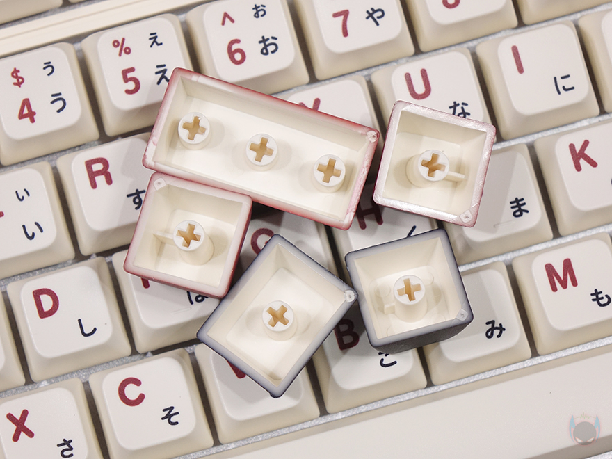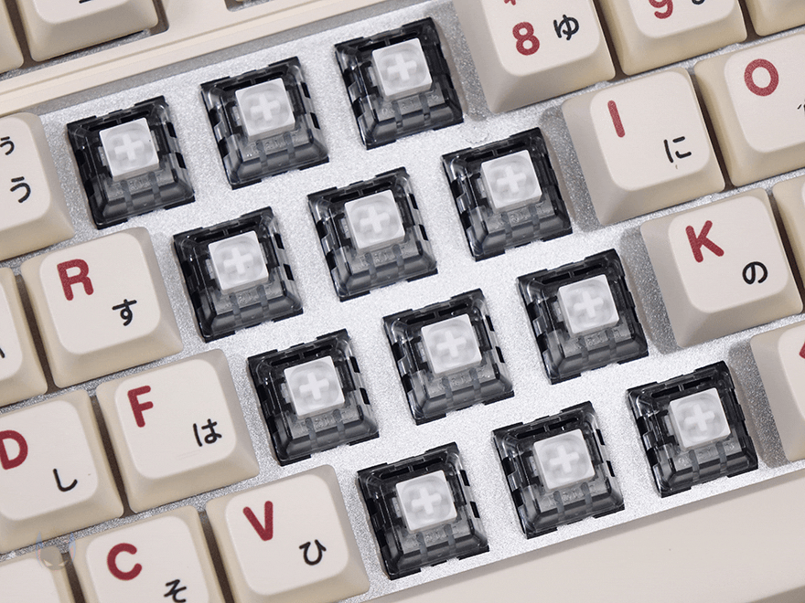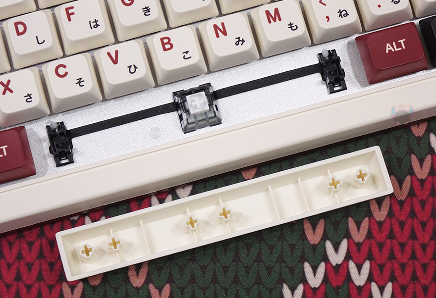 좀 더 살펴보면, 키캡은 PBT 재질이며, 조금 아쉬운 부분이라면 이중사출 방식은 아닙니다. 그리고, 스위치는 카일(Kailh)의 백축 V2 클리키 타입이며, 스위치를 분리할 수 있는 핫스왑 방식으로 적용되었고, 3핀이나 5핀의 다른 스위치와도 호환 사용이 가능하죠. LED 백라이트는 적용되어 있지 않습니다. 그리고, 스위치 장착의 플레이트 기판은 알루미늄 재질이며, 플레이트 기판과 PCB 기판 사에는 흠읍재가 적용되어 있고, PCB기판 아래 내부 하단 공간에는 흡음재가 적용되지 않았습니다. 스페이스-바 같은 긴 키들의 스테빌라이저는 체리식으로 적용되었고, 스페이스-바 같은 경우 스위치 양쪽 사이 빈 공간에 흡음재를 적용해 놨죠.