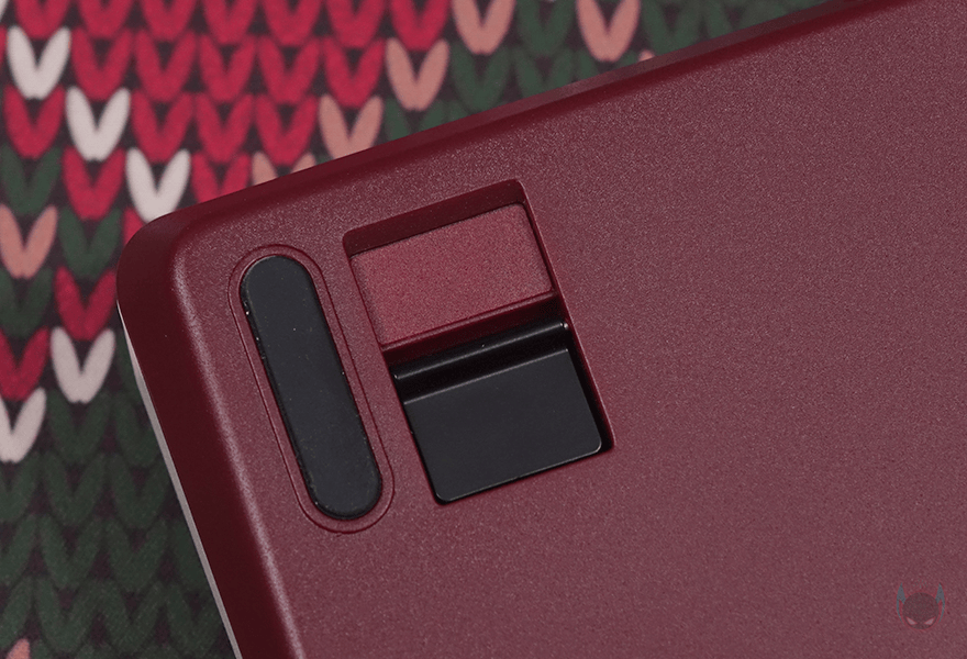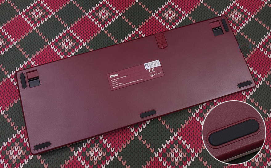 이 밖에 키보드 전면에는 한쪽에 바로 뒤에서 살펴볼 듀얼 슈퍼 버튼과 연결되는 4개의 3.5mm 포트가 배치되어 있으며, 중앙에는 USB 전원케이블과 연결되는 USB-C포트가 배치되어 있습니다. 그리고, 키보드 밑바닥 부분에는 모서리 부근으로 미끄럼방지 및 진동소음 최소화를 위해 패드가 기본 부착되어 있으며, 앞부분 중앙쯤에는 무선 2.4G 모드 이용 시 사용되는 동글 수신기가 수납되어 있고, 마그네틱 방식으로 편리하게 분리/수납할 수 있죠. 또한, 키보드 밑바닥 양쪽 앞부분에는 높낮이 받침대도 적용되어 있는데, 받침대 역시 마그네틱 방식으로 쉽게 접었다 펼 수 있게 갖추고 있습니다. 물론, 측면에서 보면 기본 높낮이도 타이핑에 최적화라 불리는 스텝-스컬처 2 단계배열로 갖추고 있죠.
