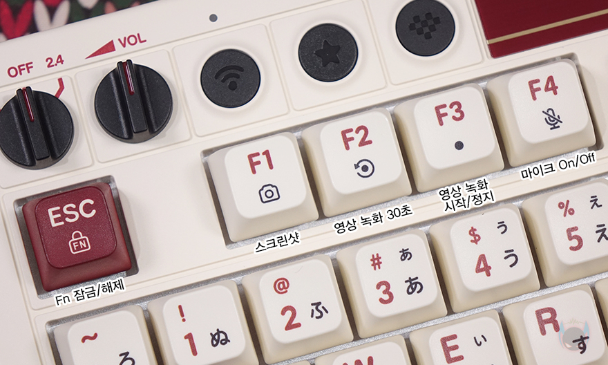 LED 백라이트 효과는 적용되지 않았지만, 레트로 108 키보드 역시 숫자키패드 위에 배치된 Fn키 조합으로 백라이트 외에 부가 기능들은 지원하고 있습니다. 참고로, Fn키와 같은 위치에 있는 음소거, 계산기, 잠금화면 키는 Fn 조합 없이 독립 실행키입니다. Fn키 조합의 부가기능에는 F1~F4키까지는 운영체제에서 지원하는 스크린샷, 동영상 녹화, 마이크 On/Off 기능을 가졌으며, F9~F11키는 재생컨트롤 기능을 가졌습니다. 그리고, ESC키는 Fn키 잠금/해제를 할 수 있고, 따로 표시되지 않았지만, 윈도우키도 잠금/해제할 수 있죠.