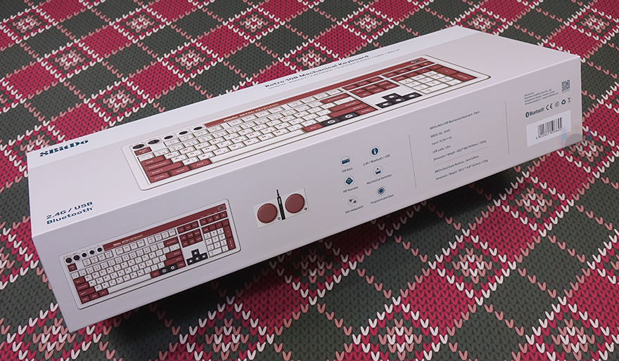 제품 패키지부터 살펴보면, 전체 박스까지 밀봉처리된 형태로 소비자입장에선 아무래도 이런 포장이 좀 더 판매 제품에는 신뢰가 가죠. 그리고, 박스 전면에는 해당 키보드 제품의 풀샷 이미지를 담고 있어서 개봉전에 미리 키보드 디자인을 확인할 수 있는데, 레트로 108 키보드는 2가지 디자인 콘셉트로 나왔습니다. 이 부분 뒤에서 다시 언급하고, 전면에는 이 밖에 모델명과 모델명 아래에 구성품 목록을 확인할 수 있는데, 박스 한쪽 측면에 구성품 일부인 키보드와 듀얼 슈퍼 버튼 이미지를 확인할 수 있죠. 또한, 주요 특징으로 108 키, 유무선 3가지 연결방식, PBT키캡, 기계식 스위치, 핫스왑, 프로그래밍 키 지원을 언급하고 있으며, 바로 옆에 제품의 기본 사양 표기도 확인할 수 있습니다. 그리고, 시작에서 언급했듯이 국내에는 (주)프론티어택 정식수입사를 통해 출시되었기 때문에 수입사 스티커도 확인할 수 있는데, 참고로 비닐에 부착되어 있기 때문에, 부착된 스티커를 떼어서 박스에 붙여놓으면 추후 AS 지원에 좀 더 수월할 수 있습니다.