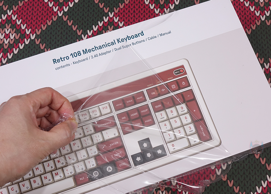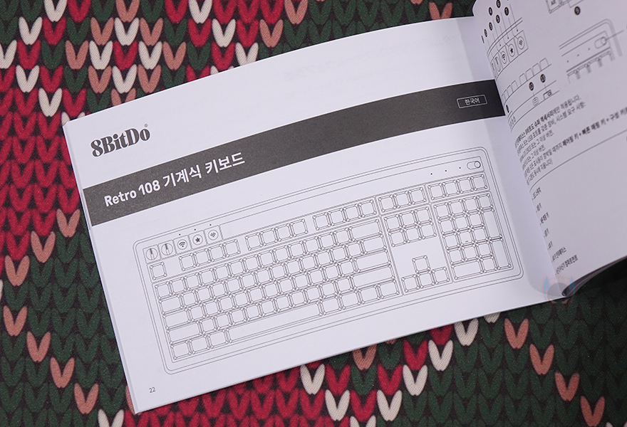 박스를 열어보면, 바로 비닐포장된 레트로 108 키보드를 확인할 수 있으며, 아래에 나머지 구성품들이 수납된걸 확인할 수 있습니다. 모든 구성품이 외부 충격보호를 위해 우레탄-폼에 맞춰 수납되어 있죠. 전체 제품 구성에는 레트로 108 키보드, USB 전원케이블, 듀얼 슈퍼 버튼, 제품 설명서 및 가이드, 굿즈 스티커 제공으로 이루어져 있으며, 국내 정식출시했기 때문에 제품설명서에는 당연히 한국어도 포함되어 있습니다.