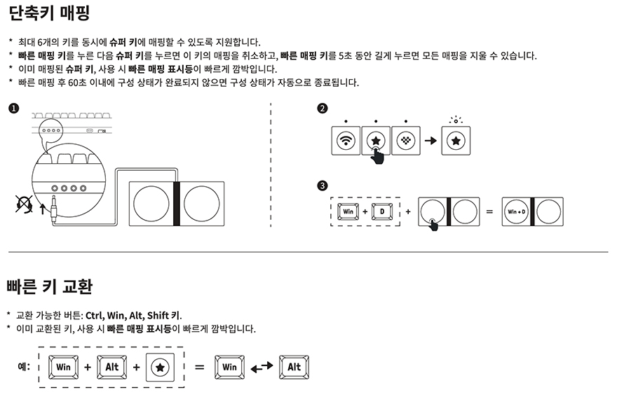 이번엔 키보드와 함께 제공되는 듀얼 슈퍼 버튼에 대해 알아보면, 큼지막한 2개의 버튼은 일종의 단축키로 사용자가 지정해 할 수 있습니다. 사용법은 간단합니다. 듀얼 슈퍼 버튼을 키보드 앞쪽에 있는 ABXY 포트 중에 꽂고, 키보드 단축키를 누를 때 듀얼 슈퍼 버튼 2개 중 하나를 함께 누르면 해당 버튼에 단축키 기능이 그대로 적용됩니다. 단축키 입력은 동시에 최대 6개를 지원하며, 기본 제공되는 2개의 듀얼 슈퍼 버튼 외에 슈퍼 버튼은 별도로도 판매하고 있기 때문에 ABXY 포트에 추가로 연결해서 슈퍼 버튼 개수를 늘릴 수 있습니다. 참고로, 많이 사용하는 단축키 기능들을 퀵-가이드로도 제공해 주기 때문에 참고하면 좀 더 쉽게 숙지할 수 있습니다.